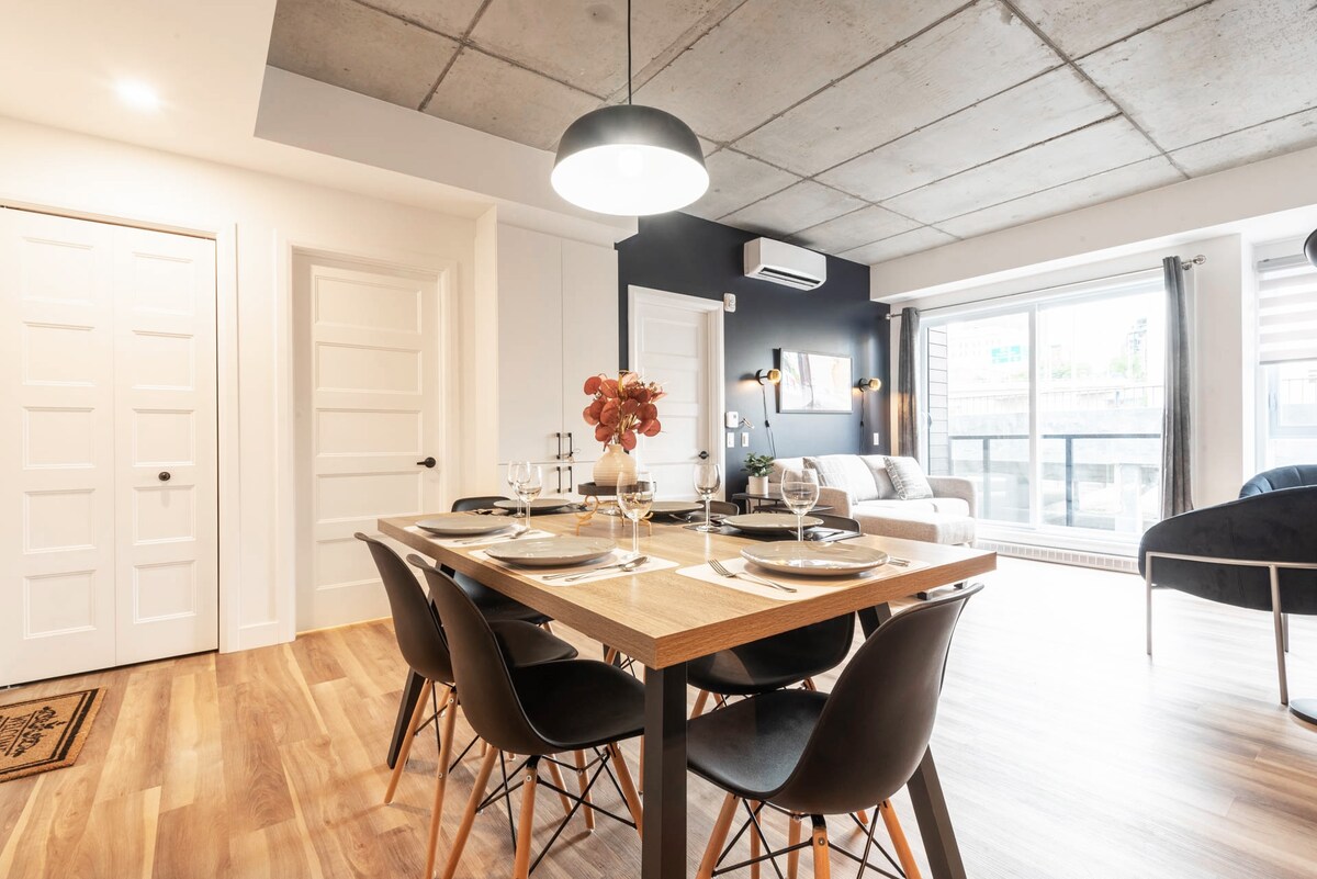 Přijeďte si užít nezapomenutelný pobyt v srdci čtvrti Saint-Roch v Quebec City. Tento moderní a luxusní apartmán vás okouzlí svými společnými prostory i interiérovým designem. ✧️ Včetně krytého parkování ✧️ Střešní terasa s bazénem, jídelním koutem a venkovním krbem ✧️ Grilování na střeše je možné po celý rok. ✧️ Fitness místnost ✧️ Světlý a příjemný byt ✧️ Rychlá wifi a pracovní prostor ✧️ Pouhých 15 minut pěšky do Starého Quebecu