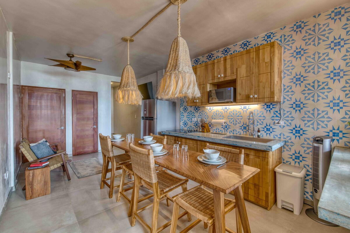 Casa Blue Rock Byt v prvním patře, který byl zhotoven s láskou a velkou pozorností k detailům, s moderním vkusem a čistým minimalistickým stylem plným světla. Prostorný pokoj se třemi matracemi, kabelovou TV, 10megabitovým internetem s Wi-Fi, kuchyní, 5místným stolem, vlastní koupelnou se sprchovým koutem s masážními tryskami. Soukromá ložnice, kde ze země vyrůstá slavný modrý kámen, s manželskou postelí. Klimatizace a dvě obrovská okna s výhledem na deštný prales