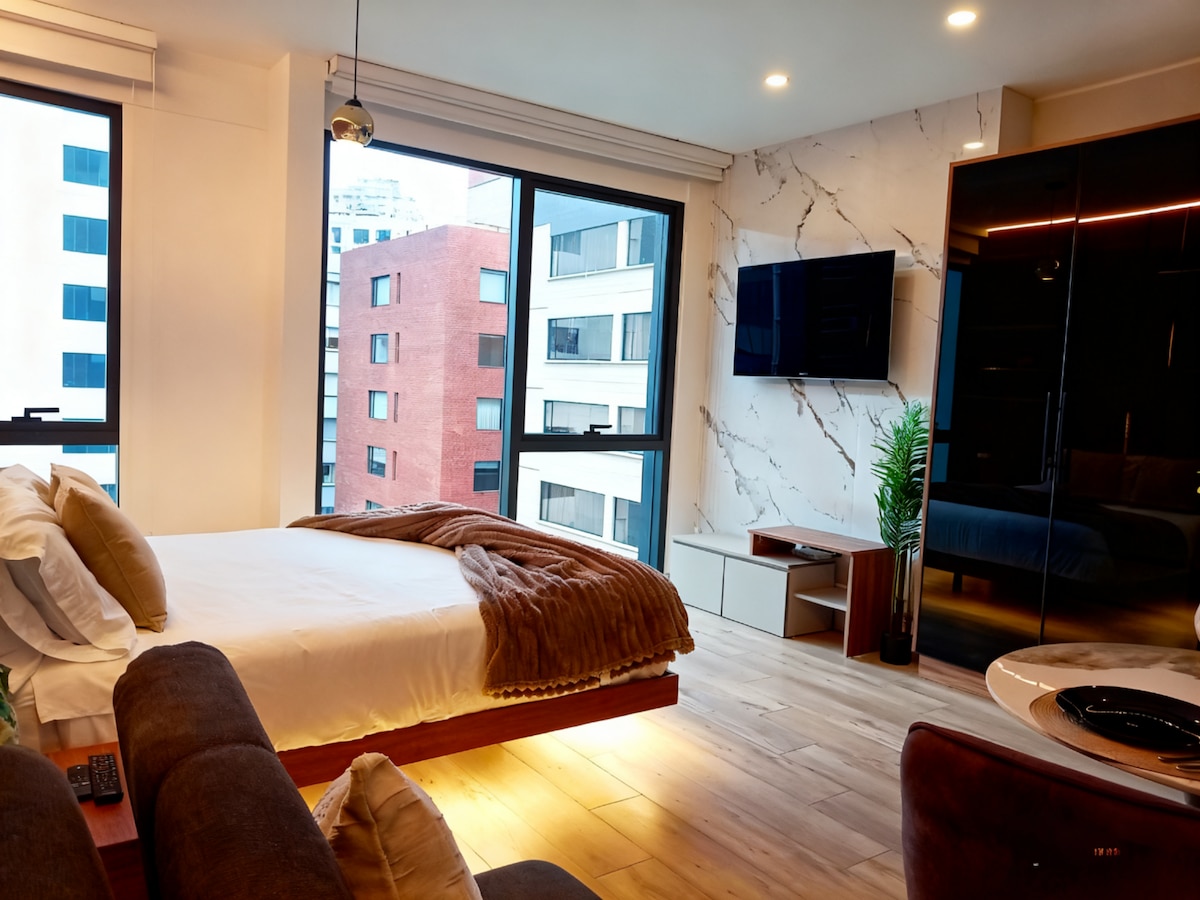 -Suite new deluxe, spacious, comfortable in Edificio Eco-efficient - Bazén , sauna , turecká, vířivka , posilovna, aplikace pro využití prostor (v závislosti na dostupnosti budovy) - Nachází se v nejlepší části Quita, bezpečné oblasti se snadným přístupem vozidlem a veřejnou dopravou - Walking Score 87, close to all walks , more than 200 businesses (upscale restaurants, malls, pharmacies, tourist sites and parks)