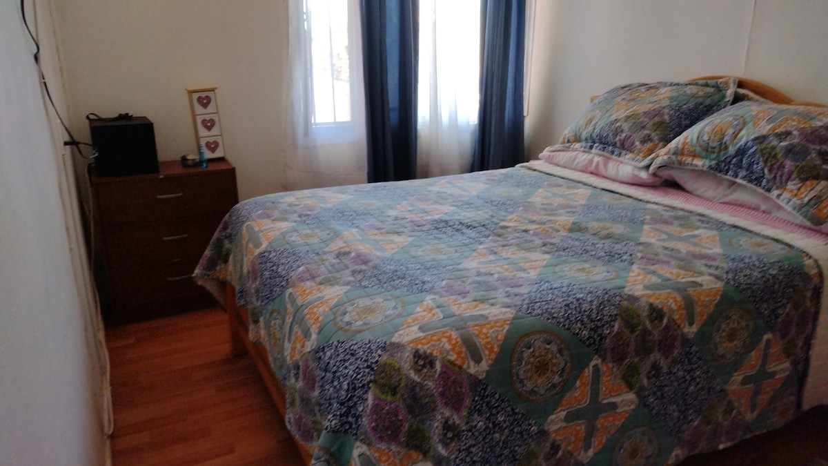 Habitación con cama matrimonial, baño privado y cocina privada, ventana con luz solar, wifi y agua caliente. Supermercados y locomoción muy cerca. Estacionamiento afuera de la propiedad. IMPORTANTE: por seguridad, NO se aceptan personas fuera de las indicadas al momento de la reserva, o diferentes de las que ingresaron el primer día.