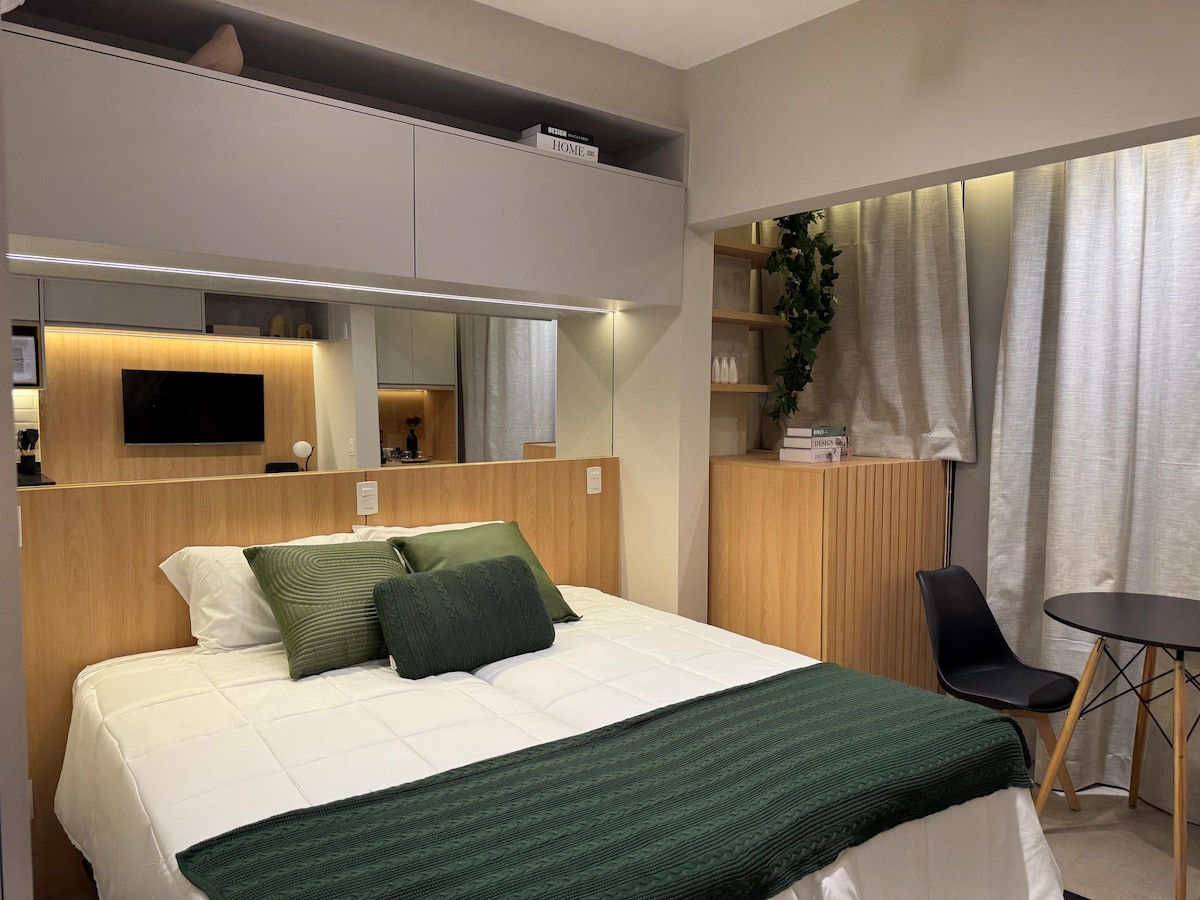 Objev naše útulné studio v srdci Tatuapé v São Paulu, ideální pro služební cesty nebo dovolenou. Díky dělené klimatizaci, moderním spotřebičům (minibar, mikrovlnná trouba, varná deska), prémiovému ložnímu prádlu a možnosti volby mezi manželskou postelí a dvou samostatnými postelemi nabízí pohodlí a praktičnost. Vynikající poloha, pouhé 2 bloky od stanice metra Tatuapé a nákupních center Boulevard a Tatuapé, 20 minut od Neo Química, 15 minut od letiště Guarulhos. Restaurace a obchody. Ideální pro nezapomenutelný pobyt.