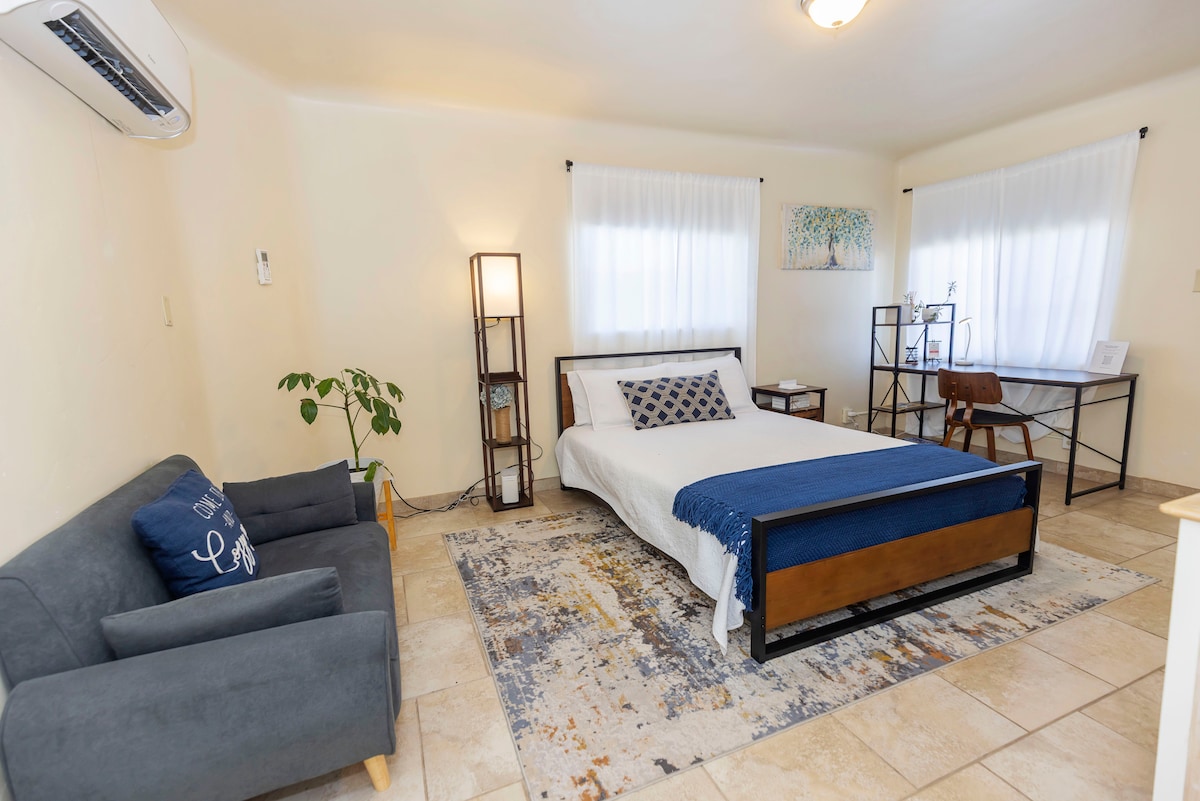 Cozy 260 sq. ft. studio apartment that can accommodate two adults Comfortable queen bed Large closet Kitchenette includes mini fridge, microwave, toaster oven, crock pot, rice cooker, French press, bar sink, cooking utensils and complete dinner service Full bath with tub Small dining table and chairs inside Wi-Fi Radio clock & USB ports Wall unit that is both AC and heat Small outside sitting area with seating and small outdoor kitchen with grill Off street parking Coded door entrance