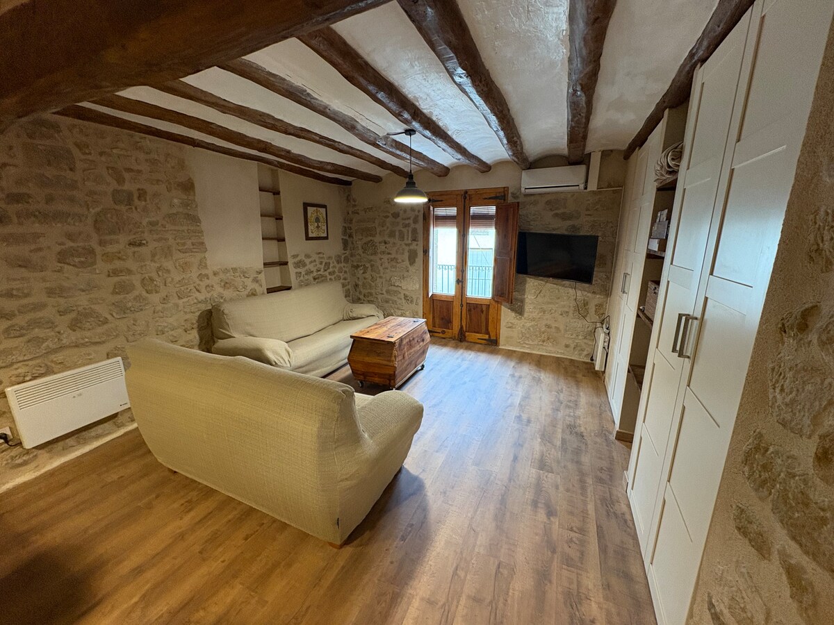 Magnífica casa de poble antiga totalment restaurada. Consta de 4 plantes i una preciosa terrassa amb àmplies vistes. Situada en un poble de l'edat mitjana encantador i extremadament tranquil. Pati exterior amb barbacoa. Centenars de Km's per gaudir en bicicleta de carretera o muntanya. Comarca rica en història i gastronomia. A l'estiu podreu gaudir de la piscina municipal, que està a tan sols 3 minuts de la casa, o anar al riu a banyar-vos. El lloc ideal per descansar lluny de la ciutat.