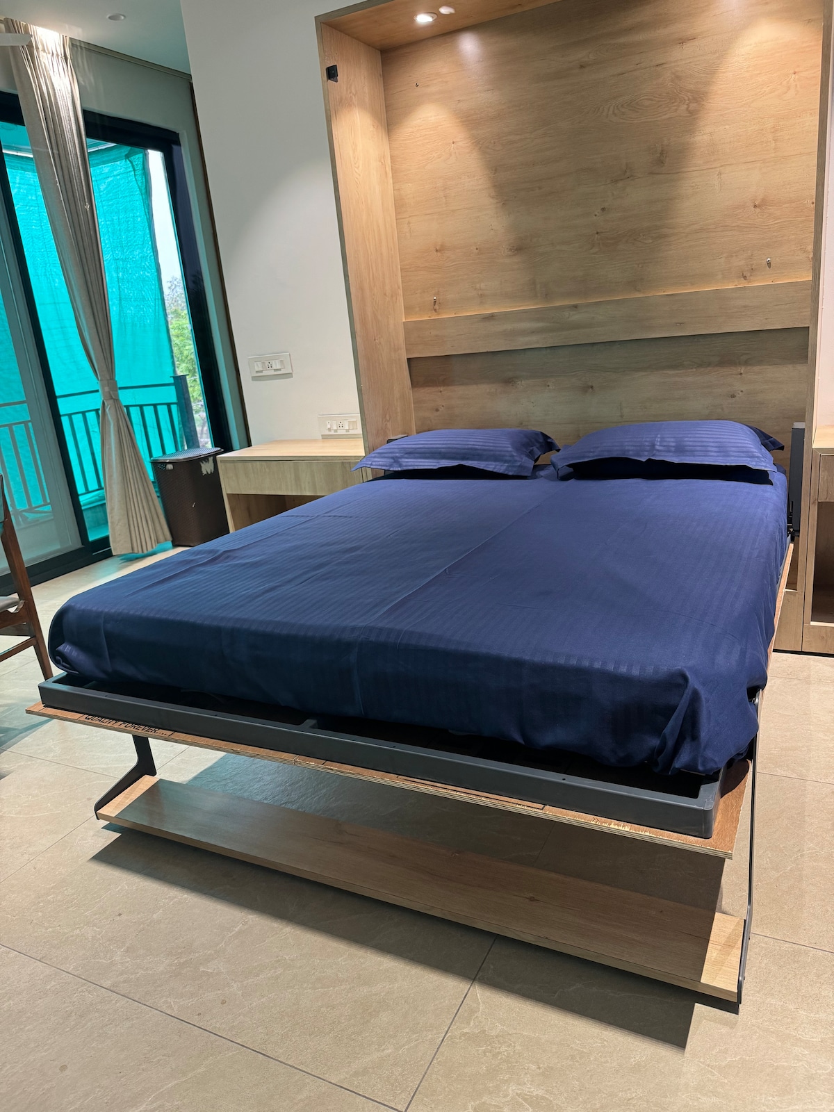 Tento garsonka s otevřeným půdorysem se řídí principy minimalistického designu. Vybavený kuchyňkou, dvěma koupelnami, velkou manželskou postelí, nástěnnou postelí velikosti Queen, TV s Netflixem, Hotstar, PrimeVideo, JioCinema a bezplatnou WiFi, tento prostor je schopen pohodlně ubytovat čtyřčlennou rodinu. Upozornění: Jedná se o byt s otevřeným půdorysem a nejsou zde žádné soukromé ložnice. Byt se nachází ve druhém patře, takže budete muset vyjít dvě patra po schodech. ŽÁDNÉ VEČÍRKY, PROSÍM, 🙏🏽 a ZÁKAZ KOUŘENÍ 🚭