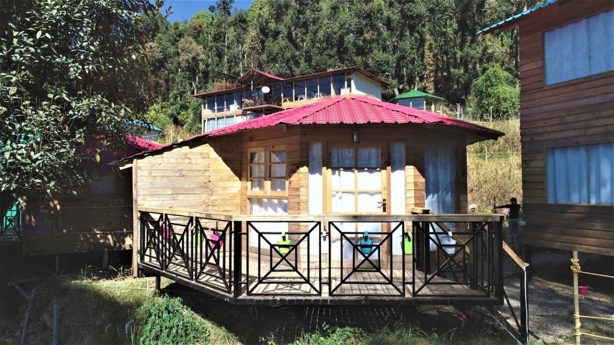 Perched on a peaceful hillside near Bhimtal within an estate, this hillside stay combines natural charm with modern comfort. With scenic views, it features a king-sized bed, wooden interiors, and a 32” TV; it’s designed for relaxation. Guests can savour sunset & sunrise vistas, unwind on the lawn with a BBQ & bonfire, or enjoy meals at the in-house dining. Close to Chota Kailash Dwar, trekking trails, Naukuchiatal (11.4 km) and the paragliding site (8.3 km), perfect for calm and adventure.