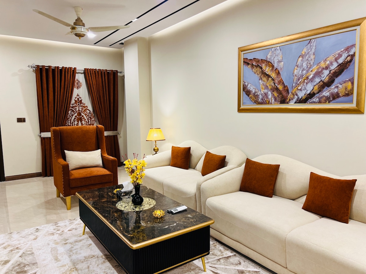 Electricity bill charged seperately based on actual use Bring the whole family to this great place with lots of room & get to be located in the best gated community of the city. -24 Hour Check-in -Daily cleaning -400m Bahria food street -60+ Restaurants around -24/7 Reception & pro hospitality staff -Completely independent -Spacious -Window w/ city view (gets great sunlight) -ACs in Rooms & lounge (heating & cooling) -LED TV -Fully-equipped Kitchen (on req. gas) -No elevator (2nd floor)