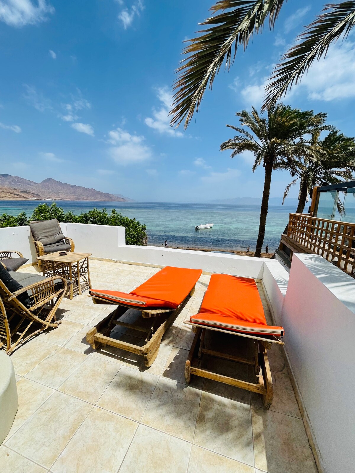 Vstup do své klidné horské chaty na pláži a vydej se na obrovskou, slunnou soukromou střešní terasu, kde tě přivítá panoramatický výhled na Rudé moře. Toto ubytování se nachází přímo na nábřeží a nabízí přímý přístup na pláž a k živému korálovému útesu, který je jen pár kroků daleko – ideální pro koupání, šnorchlování nebo prostě jen pro užívání si oceánu. Ať už chceš relaxovat na slunci, objevovat podmořský svět nebo si vychutnat místní restaurace v okolí, vše, co potřebuješ, je na dosah ruky.