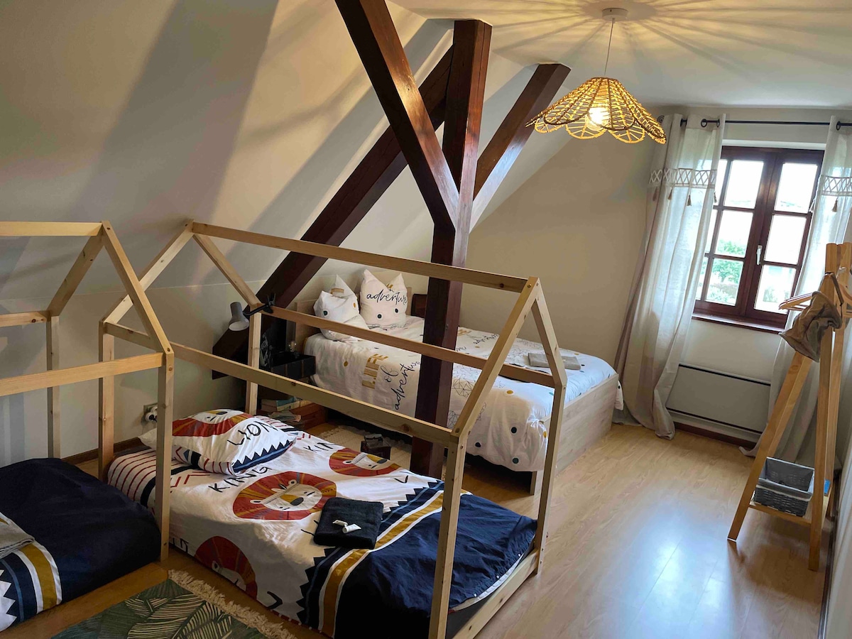 Toto klidné ubytování nabízí relaxační pobyt pro celou rodinu. Pokoj se nachází v patře prostorného domu, vlastní koupelna a WC. Přístup do kuchyně, malého obývacího pokoje a venkovních prostor. V blízkosti ubytování se nachází mnoho parků a vodních ploch: zoologická zahrada Sainte Croix, Center Pars atd.