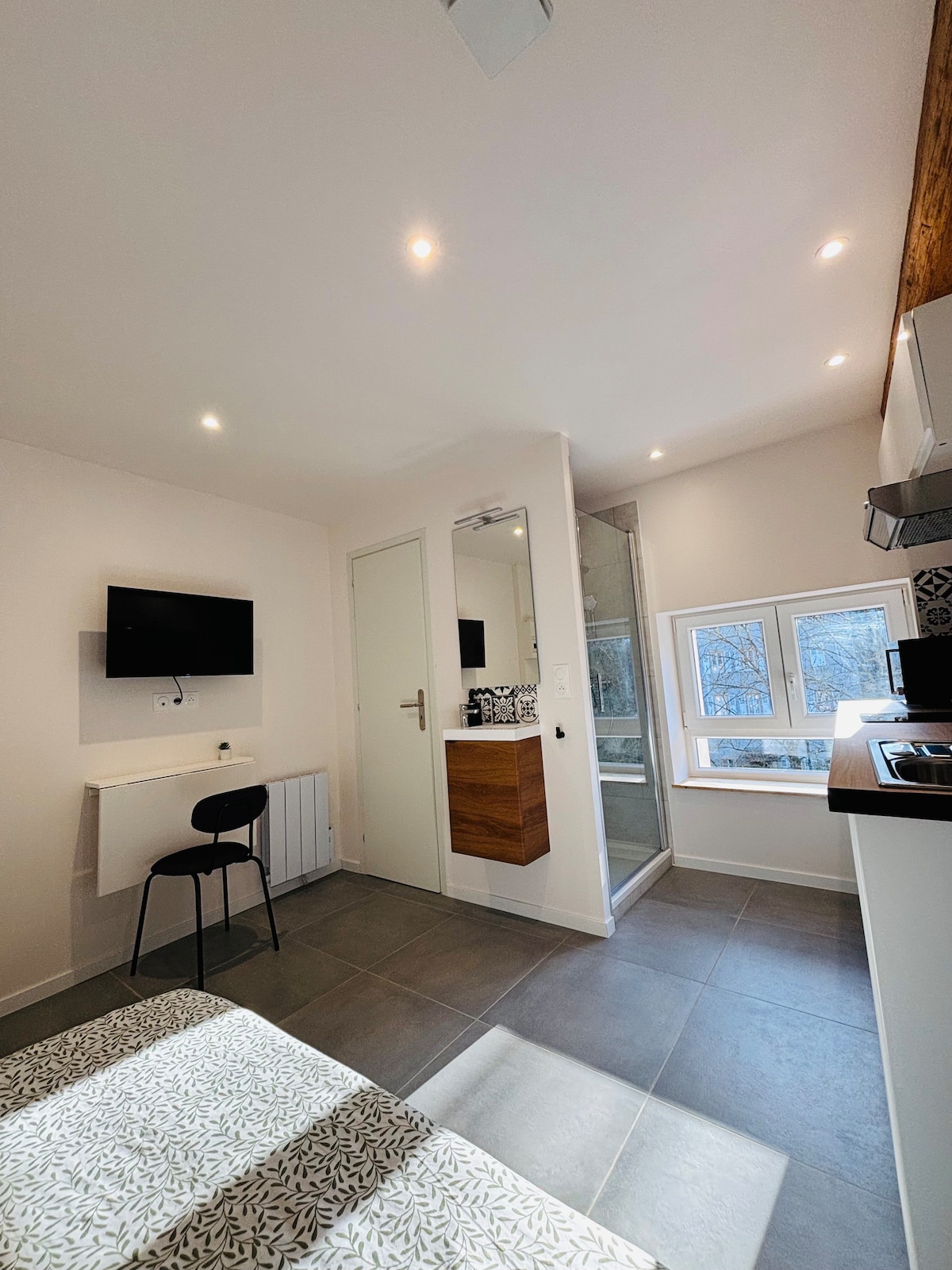 V klidné a ideálně umístěné rezidenci se ubytujete v tomto nově zrekonstruovaném a plně zařízeném studiu, které se nachází ve druhém patře (bez výtahu) zabezpečené rezidence. (Město, kde se byt nachází: Sierck-Les-Bains) Ideální pro příhraniční pracovníky, návštěvy elektrárny nebo jiné služební cesty, stejně jako pro návštěvu tří hraničních oblastí,