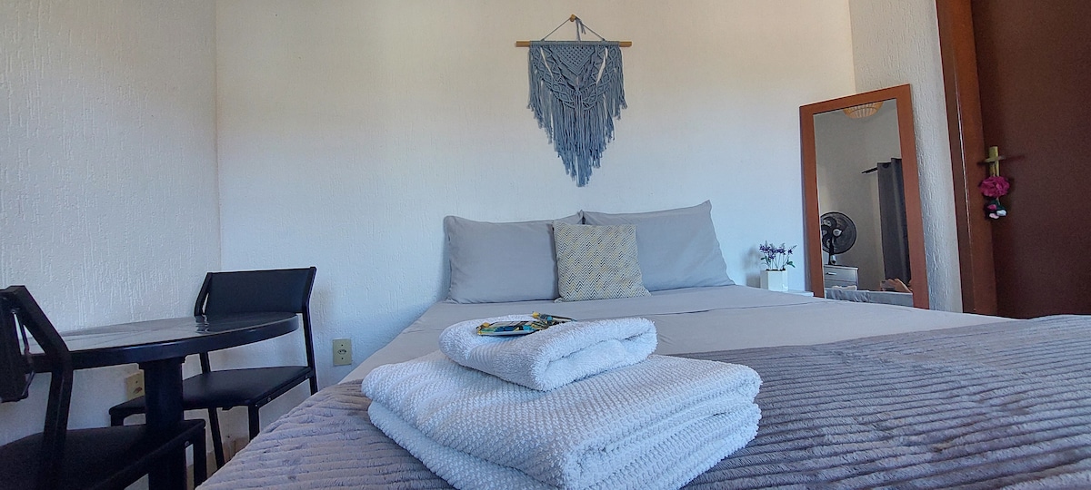 Apenas 2 minutos de caminhada até a praia! Acomodação no Centro de Rio das Ostras, próxima às praias do Centro, Iate e Boca da Barra, ao lado da Concha Acústica e Casa de Cultura. Cercada por supermercados, restaurantes, lanchonetes e farmácias, dispensando o uso de carro. Quarto com cama de casal, roupas de cama e banho, ventilador, TV, Wi-Fi e banheiro. Cozinha equipada com geladeira, cafeteira, sanduicheira, micro-ondas e mesa para refeições. Perfeito para quem busca conforto e praticidade.