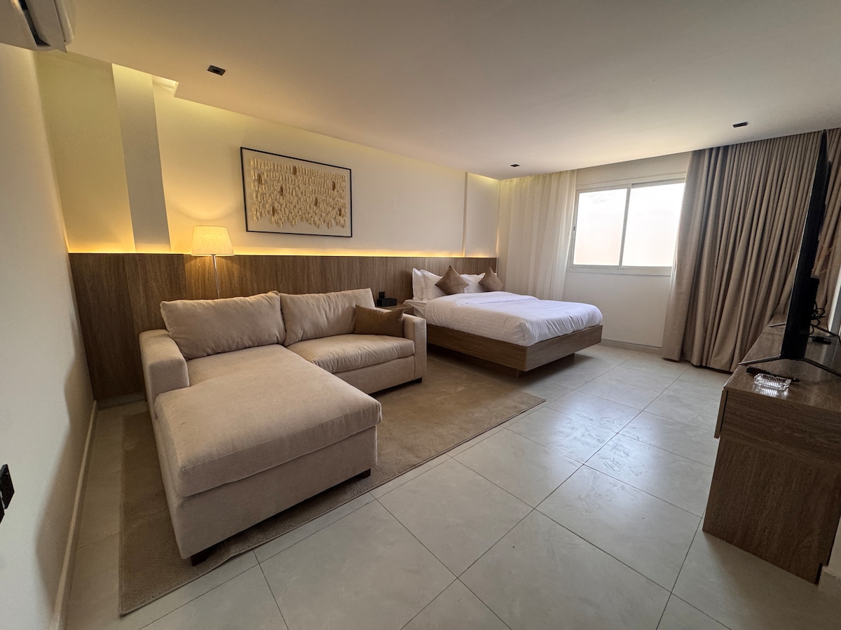 Toto studio má ideální polohu v srdci luxusní čtvrti Almalqa, v blízkosti bulváru a pulzujících destinací Rijádu. Díky 65palcovému displeji je prostor velmi vkusně vybaven, aby vám nabídl luxusní a pohodlný zážitek z pobytu. Prostor má 65palcový displej, velmi velkou postel, která vám zaručí maximální pohodlí, stejně jako luxusní nábytek a elegantní interiérový design podle vaší chuti. Ať už jsi na služební cestě nebo si chceš odpočinout, najdeš zde vše, co potřebuješ pro výjimečný pobyt