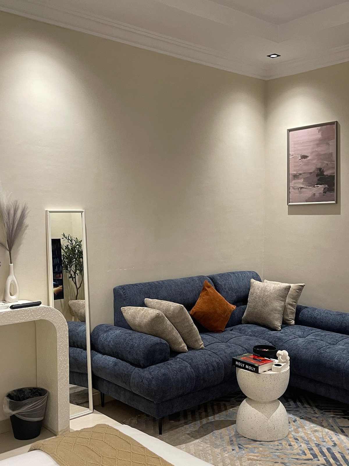 Moderní apartmán navržený pro výjimečný pobyt, který se nachází v jedné z nejlepších čtvrtí Rijádu s nádherným výhledem na KAFD. Nabízí venkovní posezení s plátnem a projektorem pro příjemné večery. Pro vaše pohodlí je postel vybavena vysoce kvalitní 14cm extra vrstvou. „Nabízíme také služby koordinace akcí pro zvláštní příležitosti (včetně dortu a příslušenství) za příplatek s předchozí rezervací, což zajišťuje nezapomenutelný zážitek.“