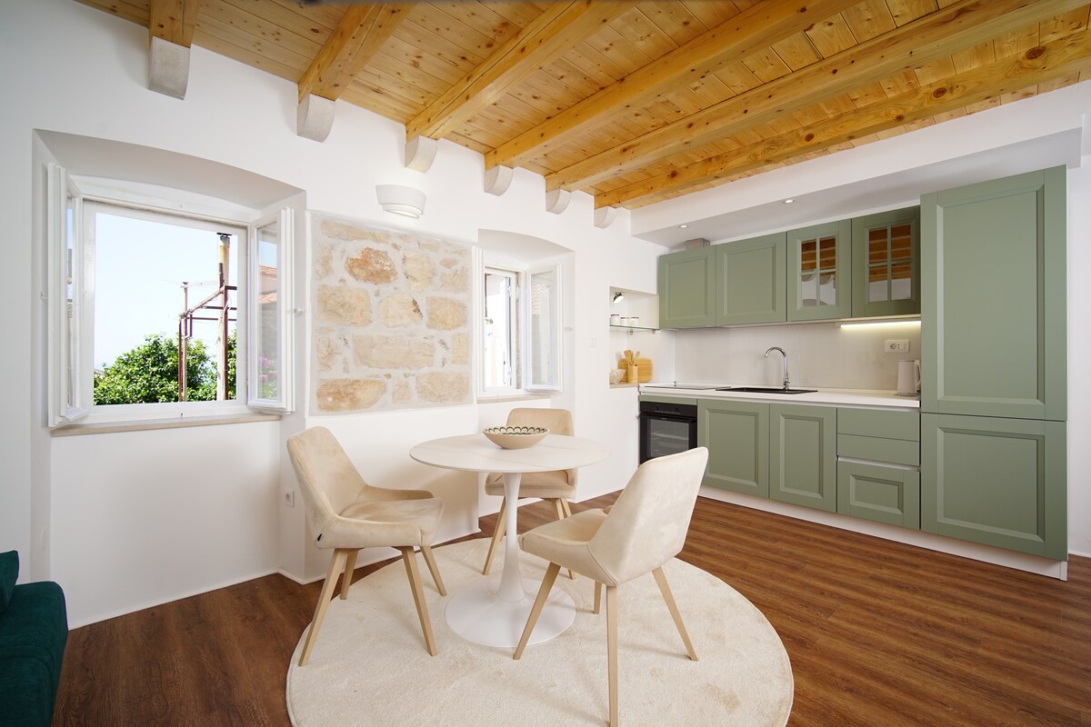 Probuď se v tomto moderním podkrovním bytě s historickým šarmem a slunečním světlem dopadajícím skrz střešní okna. Popíjej sklenku vína a sleduj svět kolem sebe z terasy tohoto modernizovaného bytu v historické budově. Vaše důvěra a bezpečnost jsou naší prioritou! Studio se nachází u vchodu do brány Buza, jednoho ze tří hlavních vchodů do pěší zóny Starého města Dubrovníku, díky čemuž je váš příjezd bezproblémový a bez schodů, a to i se zavazadly.