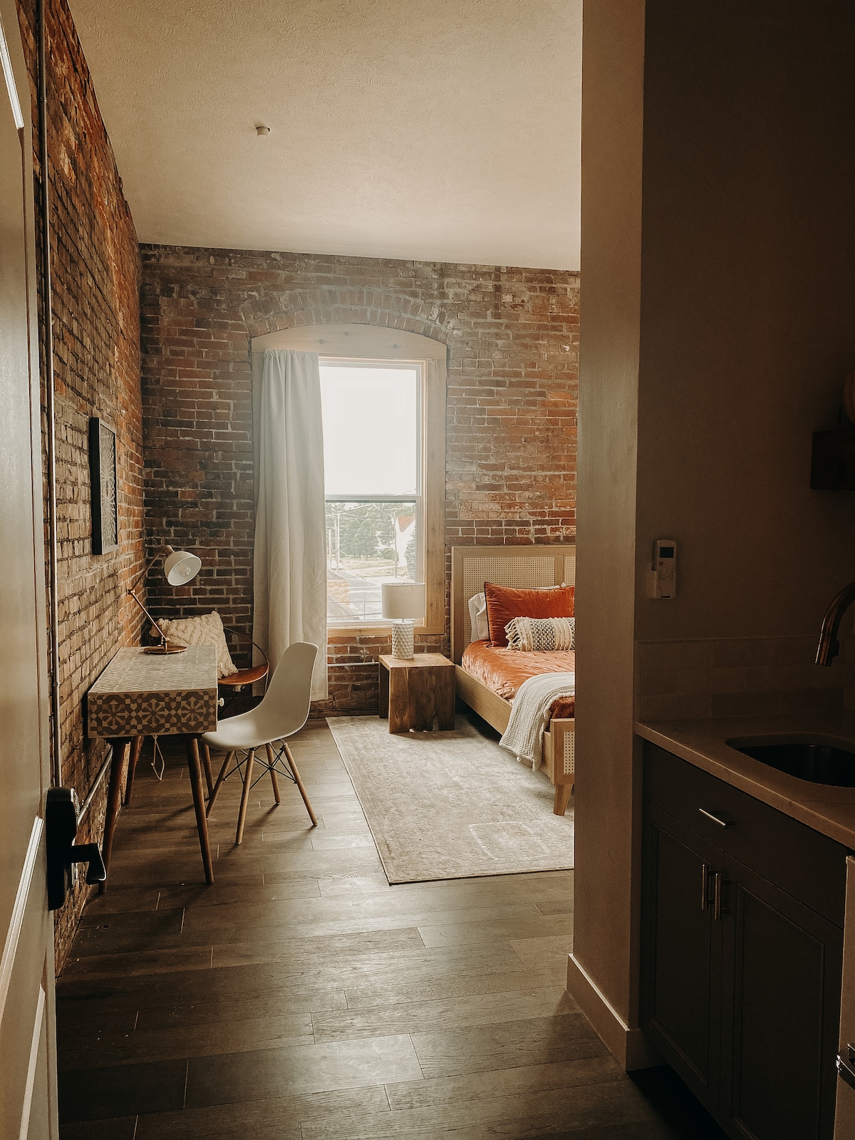 The Courthouse Loft resides in the historic courthouse used in the mid 1900s on the second floor of The City House. The original railing and gate of courtroom divides the 825 soft studio style layout. Loft has a separated bath and laundry and a patio with hot tub! Mid century and historic style will wrap you in comfort and luxury during your stay. We are above a coffee shop, so pop downstairs for breakfast and your morning brew! Oh, and never a cleaning fee!