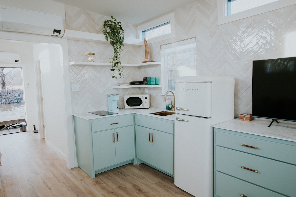 Great retreat!!!!!! This tiny house is open and feels spacious and well equipped for a weekend or over nite stay. Nachází se u zásobeného rybníka, který je ideální pro rybaření. Užij si klidné turistické oblasti, které jsou vynikající pro klid a návrat k přírodě. Koně jsou poblíž, takže si užijte, jak si hrají. Veškeré vybavení, které si dokážeš představit, velká lednice, trouba a mikrovlnná trouba, pračka a sušička. Romantický piknik s měkkými světly a dostatkem soukromí. Domácí mazlíčci vítáni! Přijď a buď naším hostem!