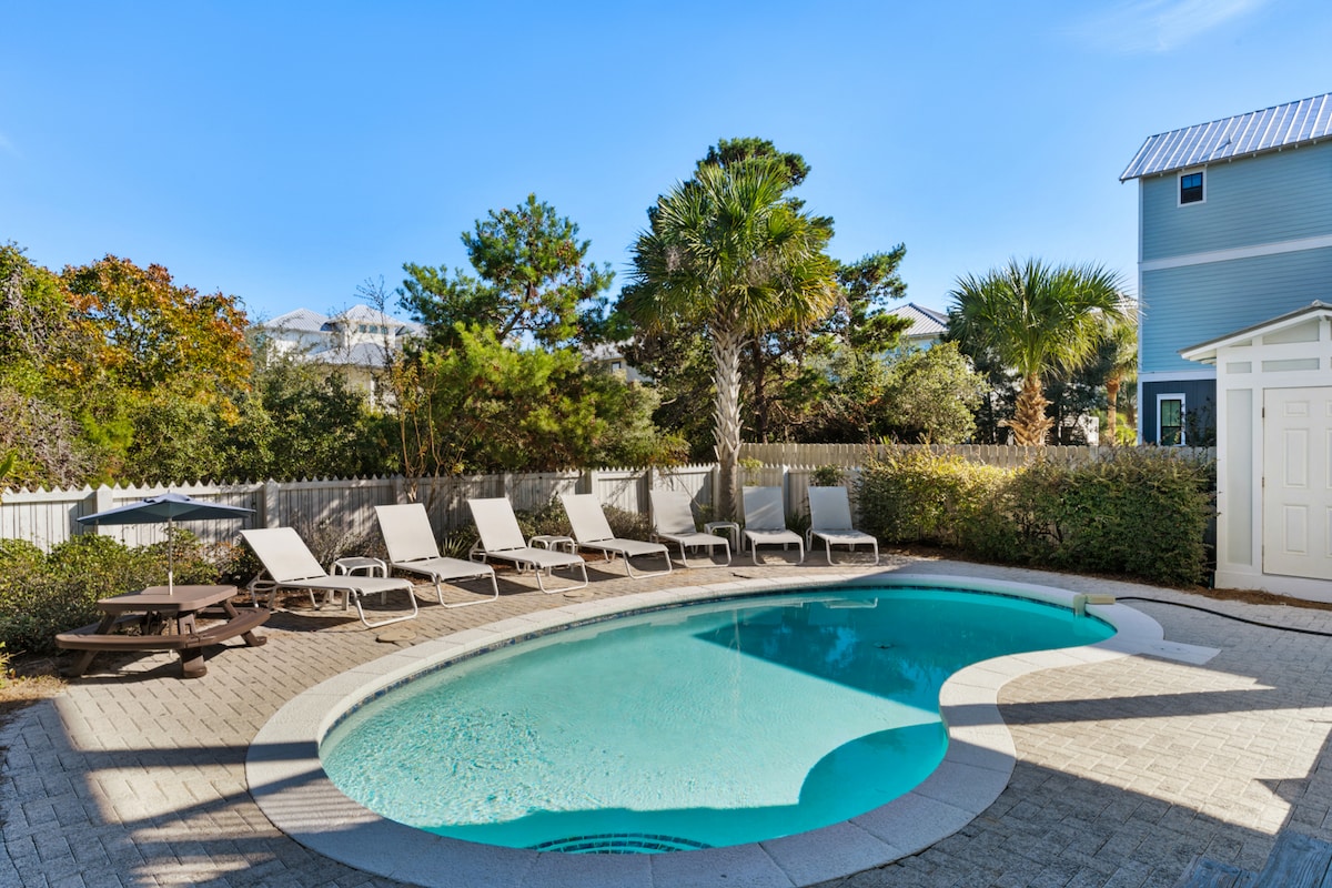 Palms by the Beach má luxusní domácí atmosféru s bazénem, venkovní sprchou, soukromým dvorkem, 7 minut chůze/3 minuty jízdy na pláž. Skvělé pro rodinný nebo přátelský pobyt! Perfektní lokalita! Méně než 10 minut jízdy do Pier Parku, 8 minut do Rosemary Beach a 30A. Do Destinu je to taky jen kousek! Cítit se jako doma díky plně zásobené kuchyni. Pohodlné ložnice a venkovní prostor s jídelním a grilovacím prostorem. V ceně jsou 2 tříkolky pro dospělé a 3 dětské koloběžky! 4místný golfový vozík k pronájmu za 85 USD na den!
