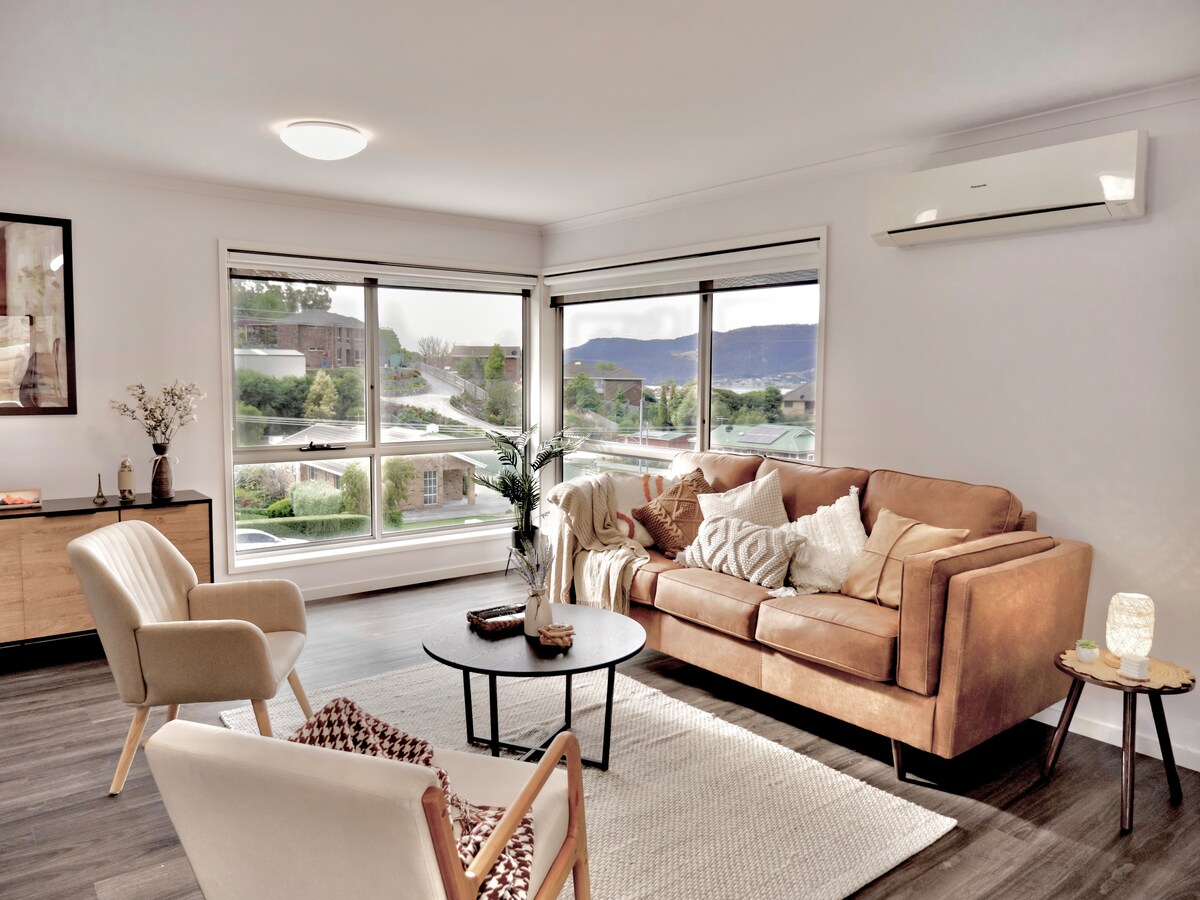 Tento dům se 3 ložnicemi, 4 lůžky a 2 koupelnami, postavený v roce 2021, nabízí výhled na řeku Derwent z terasy. Uvnitř je klimatizace s reverzním cyklem (topení) v otevřeném obývacím pokoji/jídelně a automatické topení v ložnicích, které udrží Tassie chlad daleko od vás, zatímco spíte. Kuchyně má vše, co potřebujete k přípravě jídel, zatímco prádelna má pračku a sušičku pro delší pobyty. Poskytujeme 50mbps optické připojení NBN a obří 75" TV pro filmové večery. Woolies a mnoho dalších obchodů je méně než 5 minut autem.