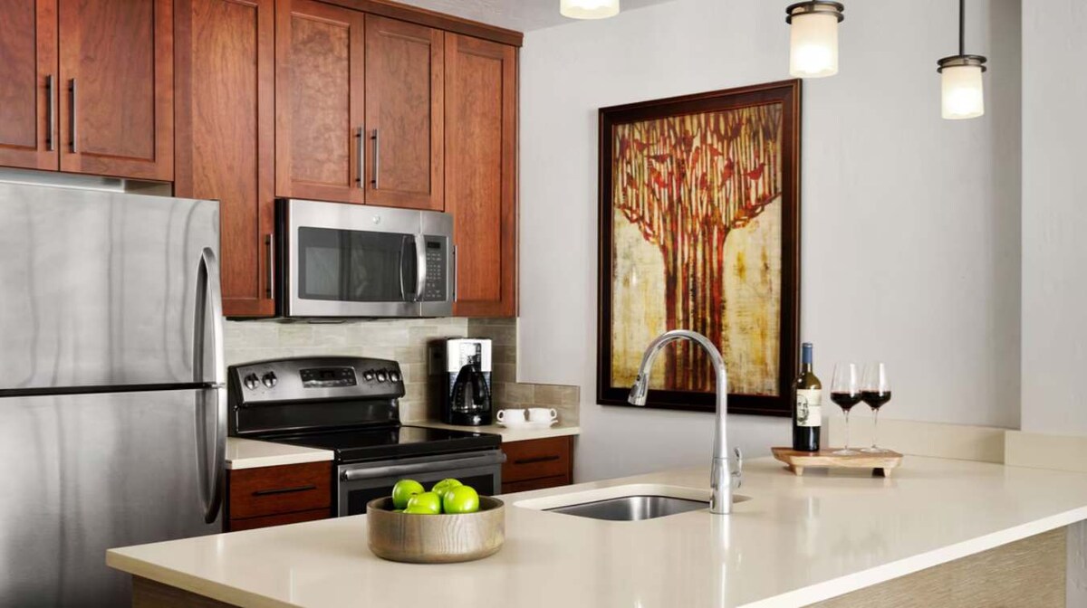 Vychutnej si naše apartmá Deluxe s 1 ložnicí, 840 až 888 čtverečních stop, které je navrženo tak, aby pohodlně ubytovalo až čtyři hosty. Apartmá má luxusní manželskou postel King, rozkládací pohovku Queen a soukromý balkon nebo terasu pro klidnou relaxaci. Užij si pohodlí plně vybavené kuchyně, pračky a sušičky v jednotce a moderního vybavení, jako je vířivka, krb a bezplatné Wi-Fi. Mezi další funkce patří fén, trezor na pokoji, DVD přehrávač, stereo a televize.