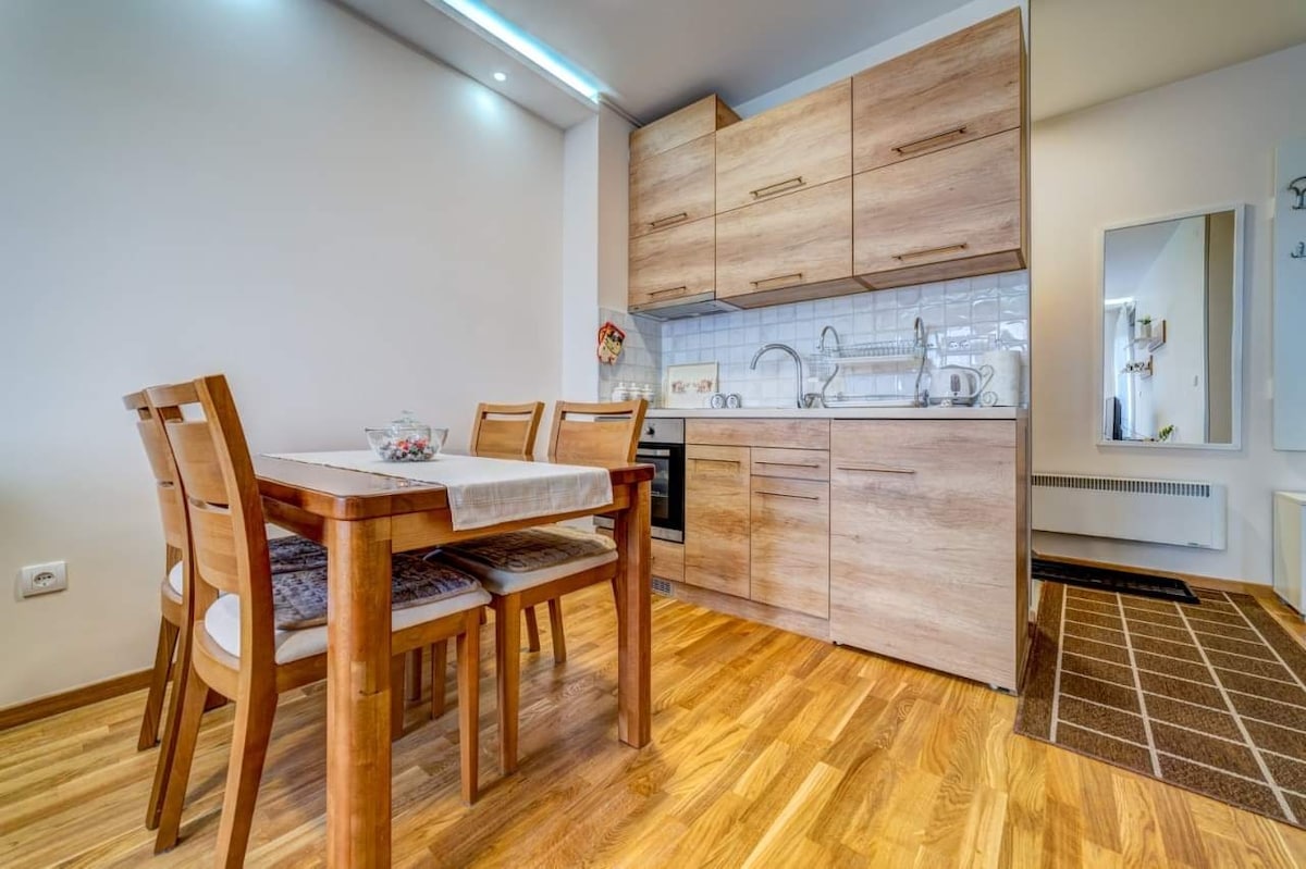 Oblast Zlatiboru je horským rájem. Při plavbě do komplexu mezi vysokými borovicemi se okamžitě budeš cítit uvolněně. Když vstoupíš do našeho zbrusu nového bytu, budeš mít ten příjemný pocit z domova. Tento zbrusu nový pokoj s jednou ložnicí je plně vybaven - včetně krbu. Spusť prémiovou matraci navrženou tak, abys mohl/a spát jako dětská noc. Budova je zabezpečená budova s parkováním zdarma před domem. Budeš jen pár kroků od centra města a všeho dění