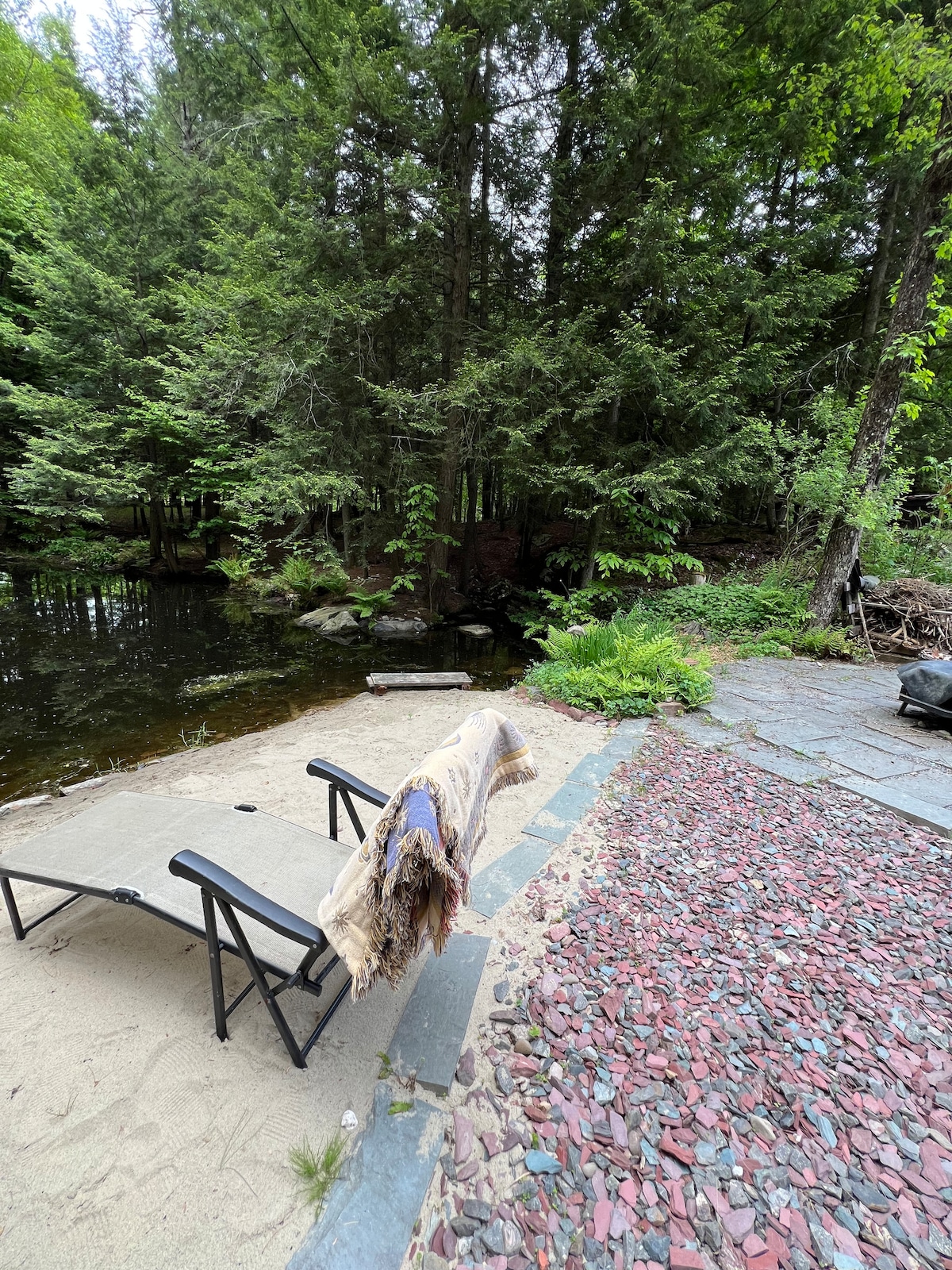Jedinečná centrálně umístěná, klidná venkovská chata mezi Adirondack a Green Mountains na 60 akrech. Pokud vám zde nebude fungovat telefon, je k dispozici Starlink. Poblíž Lk George, Lk Champlain a VT. V okolí můžete chodit na výšlapy, rybařit a plavat. Klimatizace v přízemí pro letní měsíce. Náš 9120 wattový solární panel napájí náš majetek. Během chladných měsíců si užijte kamna na dřevo. V zimě je nutný pohon všech kol. Máme prostornou terasu u společného bazénu, pergolu a stinnou terasu u potoka.