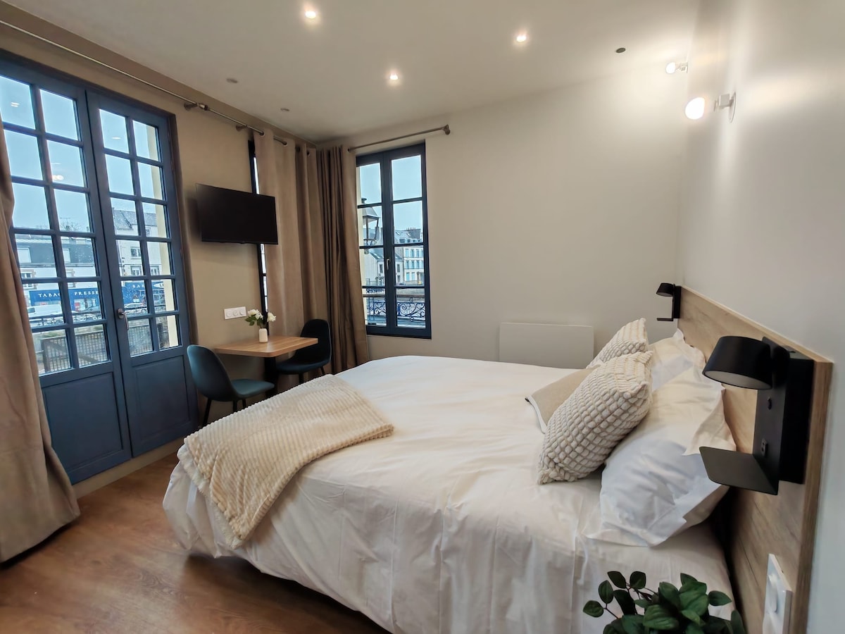 V srdci historického centra Quimperu, ulice Kéréon a její barevné hrázděné domy. Studio ve druhém patře, na úpatí katedrály, výjimečná poloha. Budova s červenými/růžovými okny na venkovních fotografiích. Wifi a připojená televize, optické připojení. Ložní prádlo, ručníky, povlečení a povlak na peřinu jsou součástí vybavení, postel je ustlaná před vaším příjezdem. Ubytování je zařazeno do kategorie 2 hvězdičky v oblasti turistického ubytování.