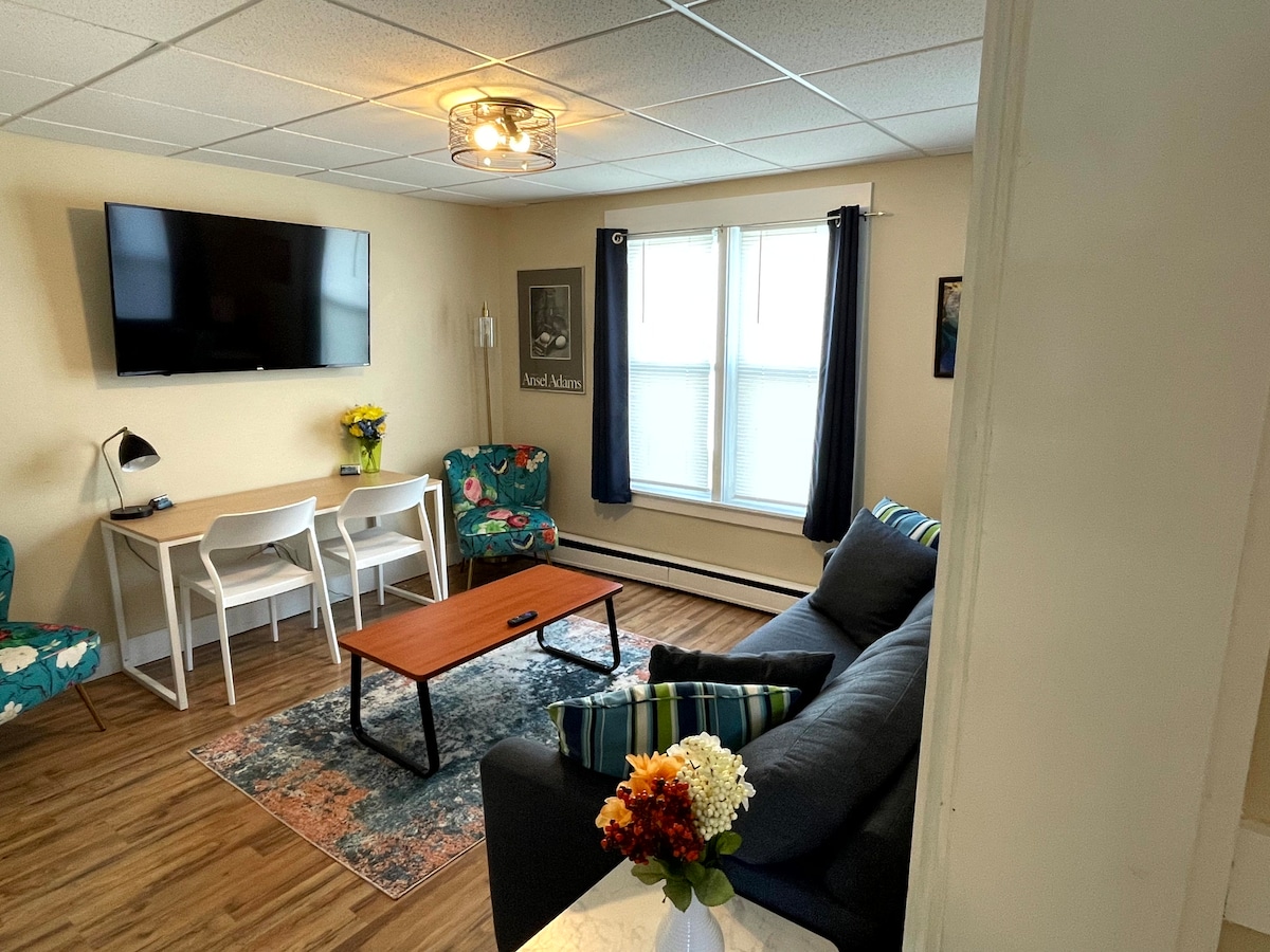 This is a one bedroom apartments with an open kitchen / living area. The bathroom is fully tiled with a large shower. The bedroom has a comfortable new queen size bed with plenty of closet space and chest of draws to store your cloths. Safe dedicated parking across the street. walking distance to laundry facility. Walking distance to restaurants and pubs (Mexican, pizza, Chinese, American/Bermudian). Supermarket is close by. Convenient to Highland Mountain Bike park, skiing, snowmobiling,, bike/walking trails, and the New Hampshire Lakes