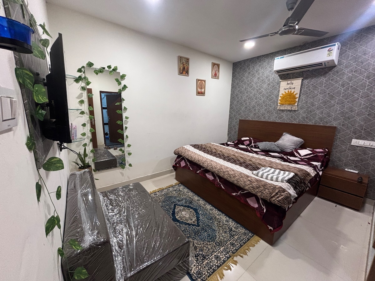 Cozy studio in JTPL, Sector 115, Mohali—perfect for families, couples (married only) or travelers. Spacious, with Wi‑Fi, TV, kitchen, and workspace in a safe, prime location. Car on rental basis will be provided subject to availability. Book now! Caution Note:- Not suitable for unmarried couples. If the booking is made for a group of boys/male guests, a maximum of two guests will be permitted.. Please read the guest access before booking to avoid inconvenience.