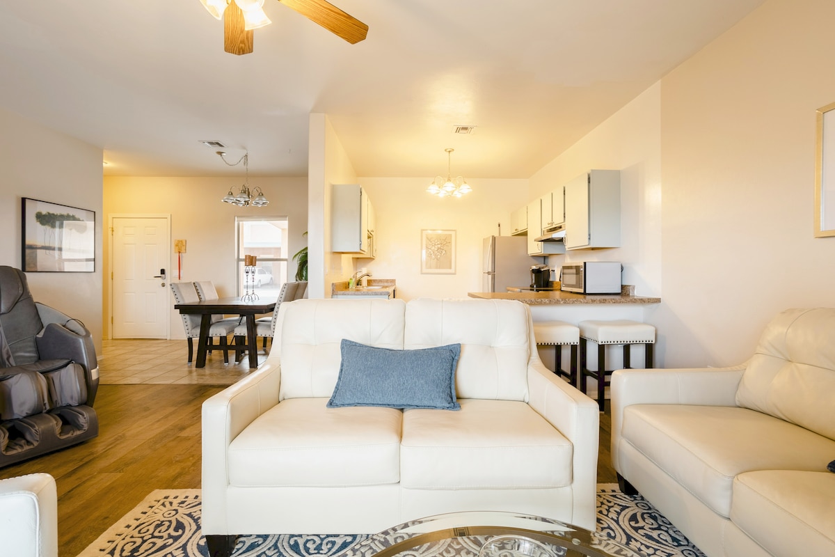 Our very clean 2 bedroom 2 bath home features a zero gravity massage chair, comfortable mattresses, soft throws, a fully stocked kitchen, fast wifi, and convenient USB ports in 3 rooms. The neighborhood has a community pool, hot tub, gym access, walking trail and ramadas to name a few! This home sleeps 6, has a private backyard, and 2 covered parking spaces. Right around the corner from the grocery store, movie theater, and multiple golf courses! This clean and relaxing space is sure to impress!