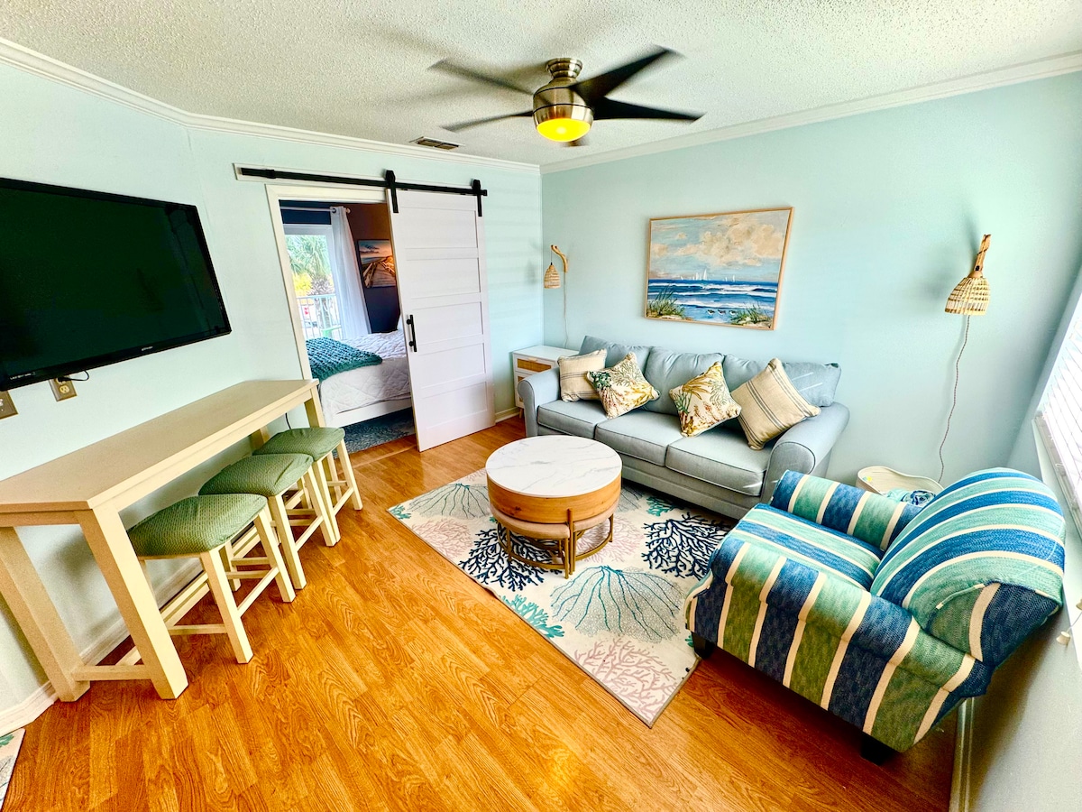 „Flipflop life“ – prostorná jednotka s 1 ložnicí a 1 koupelnou v docházkové vzdálenosti od pláže! Pro rodinu až 3 osoby. Jednotka se nachází v sekci soukromých domů ve východní části PCB. Velmi klidné sousedství. V pěší vzdálenosti od pláže, asi 5 minut. Užijte si zcela novou, pohodlnou postel z paměťové pěny, WiFi internet, chytré televize, plně vybavenou kuchyň, pračku a sušičku v jednotce, parkování u předních dveří. 1 parkovací místo. Jednotka plně zásobená vším, co potřebujete pro krátký pobyt! Pro rezervaci musíte být starší 23 let.