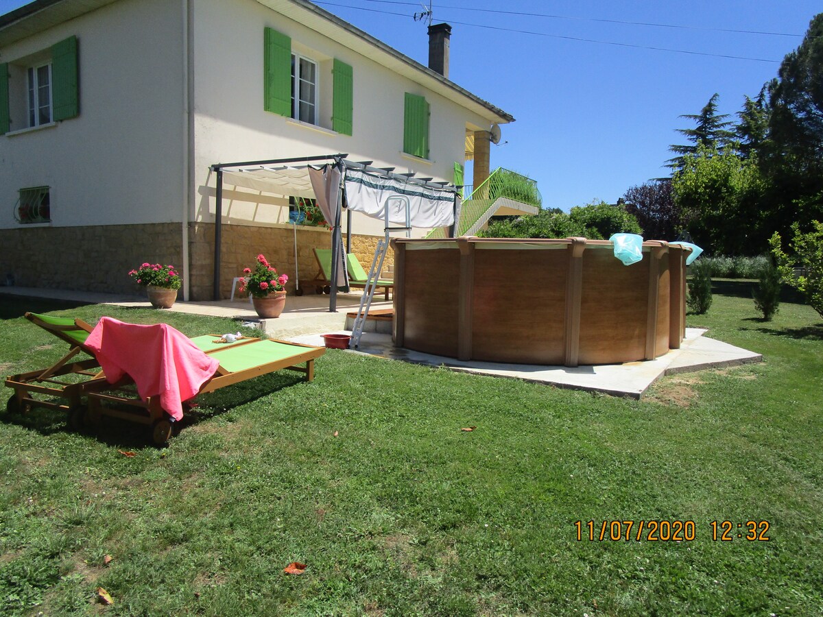 Ubytování v přízemí zalesněné a oplocené nemovitosti s velkým parkem o rozloze 7000 m2. Ložnice s manželskou postelí a obývacím pokojem s vybavenou kuchyní, TV koutkem a manželskou postelí. Klidné sousedství v docházkové vzdálenosti od obchodů v bastide (300 metrů) Ubytování je na půli cesty mezi Bergeracem a jeho vinicí a Sarlat hlavním městem Périgord Noir. Ideální pro objevování bohatství Dordogne.