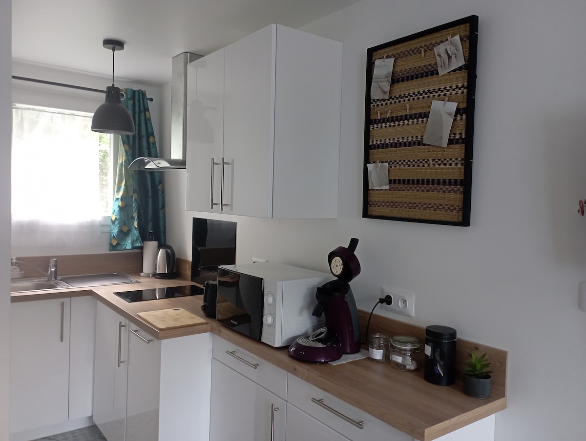 Domek o rozloze 28 m² s terasou postavený v zadní části naší zahrady. Jedná se o malý zařízený apartmán pro 2 dospělé (manželská postel v ložnici) + 2 malé děti (rozkládací pohovka v obývacím pokoji). Nachází se v blízkosti hlavních dopravních tepen v klidné rezidenční čtvrti. Centrum Caen je vzdáleno 3,5 km (hrad).