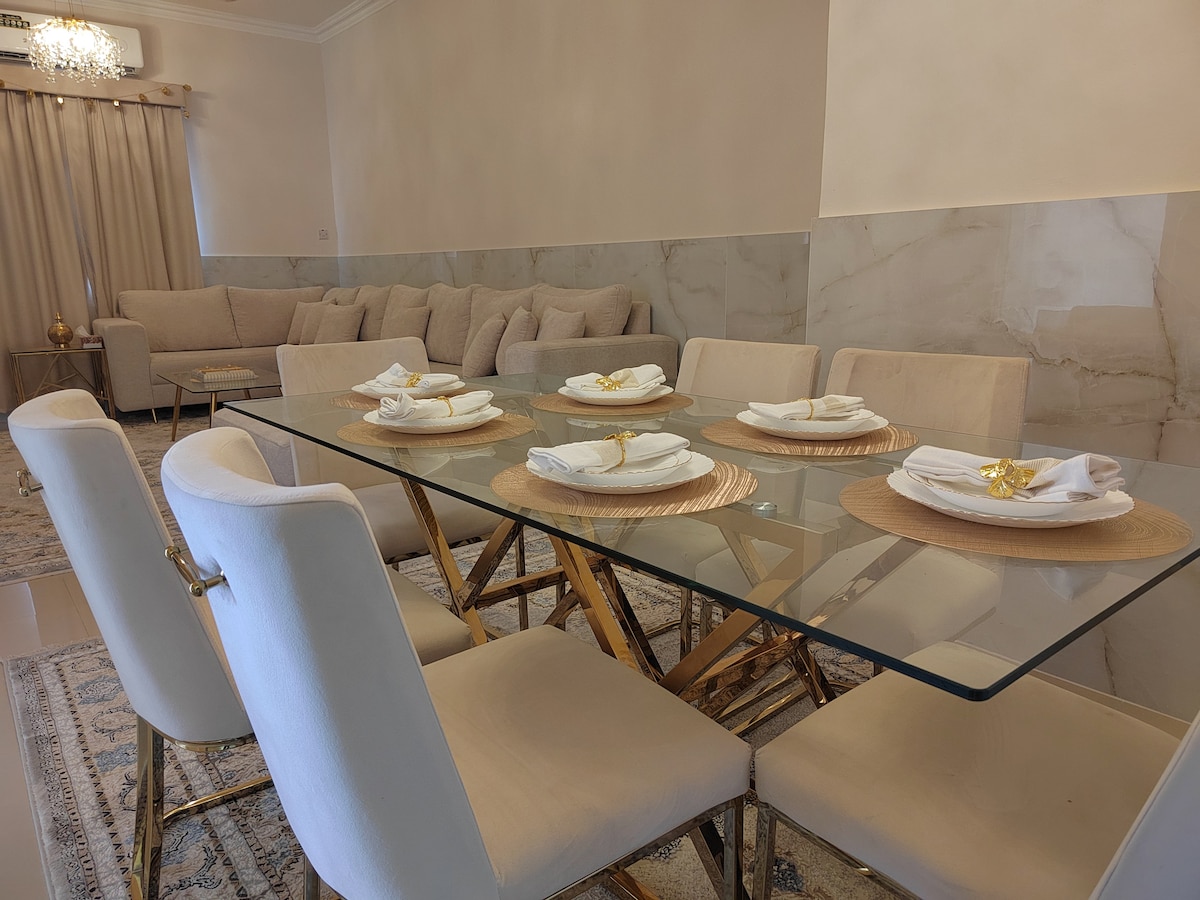 „Prostorný a stylový apartmán se 2 ložnicemi v New Salalah | 3 koupelny, velký obývací pokoj, otevřená kuchyně a prádelna“ Vychutnej si stylový zážitek v tomto apartmánu v centru Nové Salalah, který je ideální pro rodiny, přátele nebo služební cesty. Byt je navržen s ohledem na pohodlí a praktičnost, je vybaven moderním nábytkem, má 2 ložnice, 3 koupelny, velký obývací pokoj, otevřenou kuchyni a vyhrazenou prádelnu a skladovací místnost – nabízí spoustu prostoru k relaxaci a pocitu domova