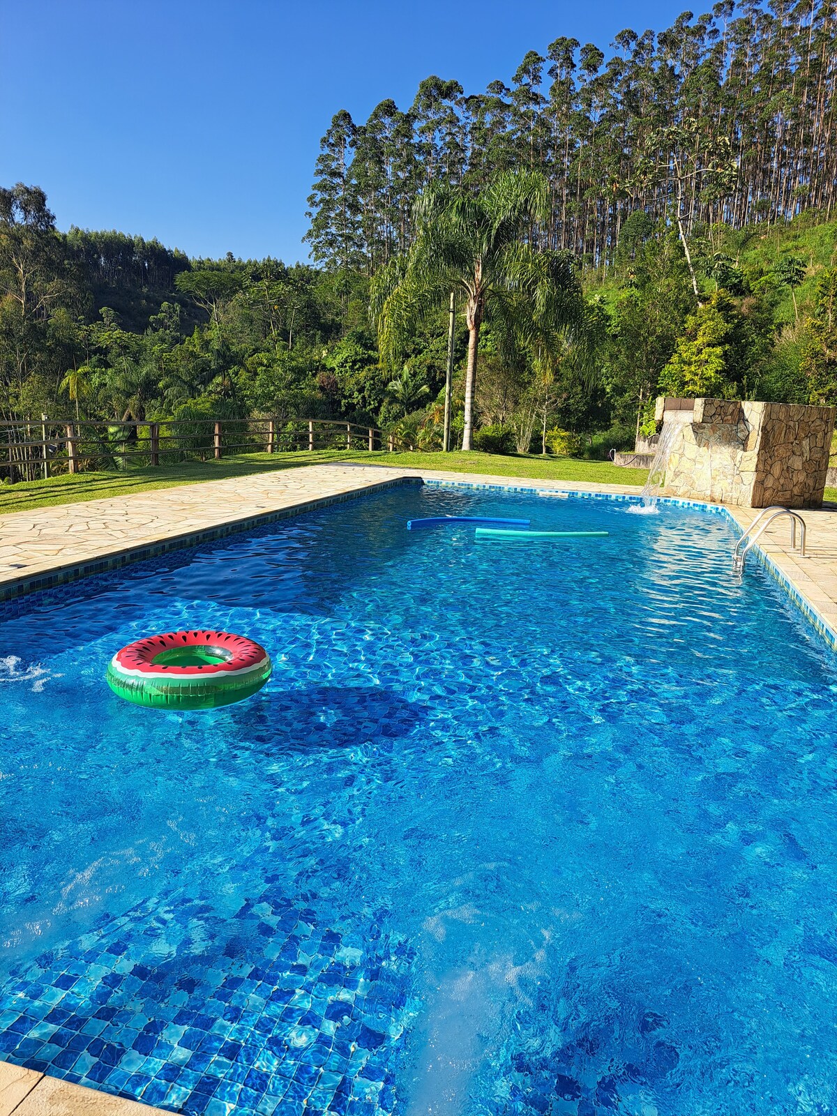 Relaxe na nossa chácara com acomodações para até 12 pessoas em 2 quartos e um mezanino Possui 1 banheiro com chuveiro na casa e outro sem chuveiro na churrasqueira Aqui tem sala com lareira, internet, 2 smarts TV, churrasqueira, piscina adulta e infantil com prainha, campinho de futebol, quadra de tênis, rede de vôlei para grama ou piscina, cantinho da fogueira, playground para crianças e muito espaço para caminhar E uma vista incrível que vai trazer muita paz e tranquilidade para sua família