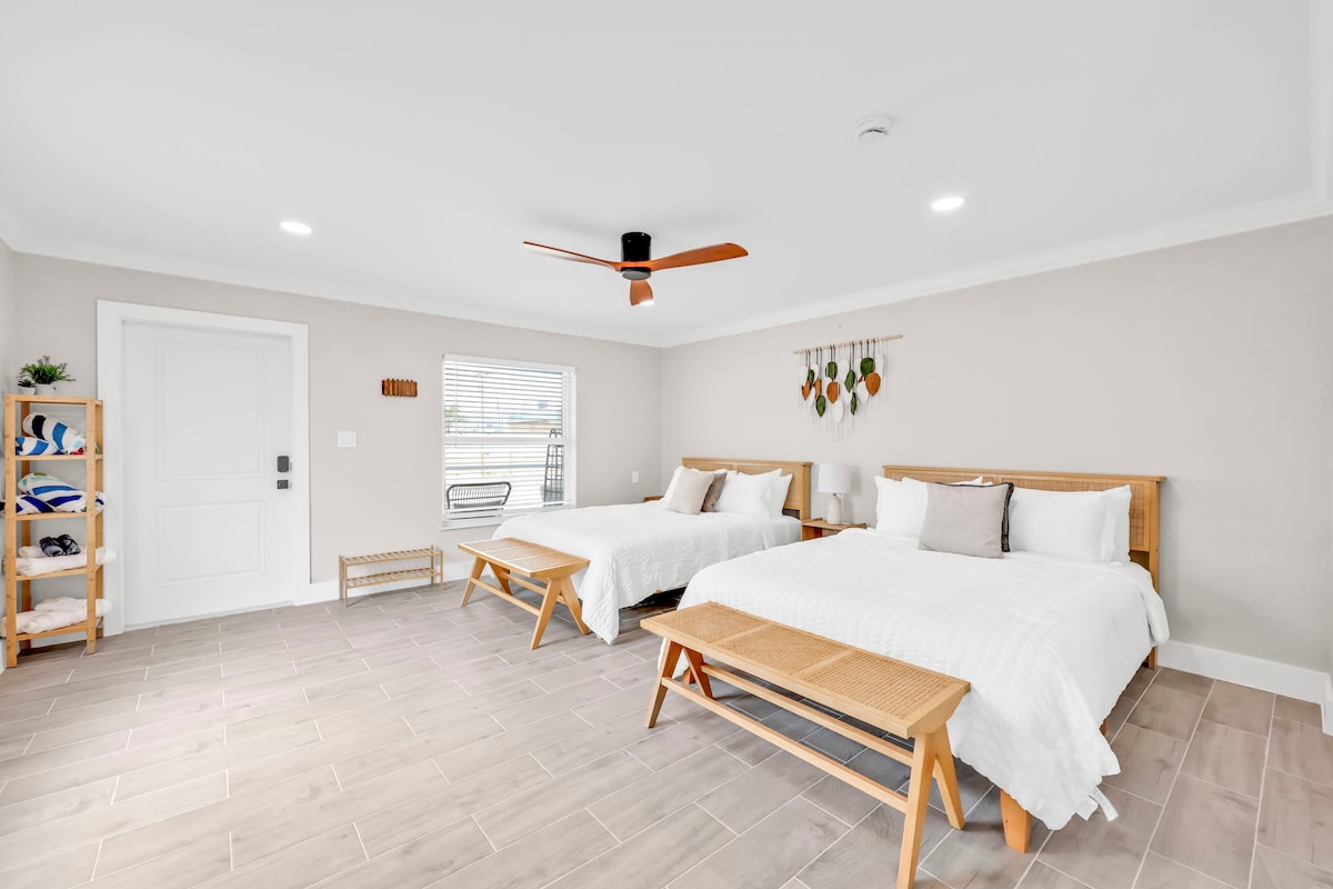 Stay just 600 ft from the beach and a 10-min walk to downtown Fort Myers Beach, with bars and restaurants like Mr. Waves Island Bar. This cozy bungalow sleeps 4 with 2 queen beds, a full kitchen, and a luxurious shower in the full bathroom. Enjoy the patio, grill-ready back porch, and a large garden perfect for outdoor games. We provide beach chairs, umbrella, cooler, and towels—everything you need for a perfect beach day.