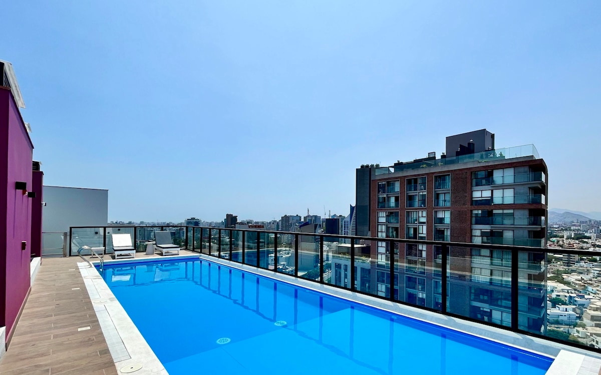 Objev oázu v San Isidro, v blízkosti obchodního centra a obklopenou obchody, restauracemi a nákupními centry. Naše ubytování je ideální pro 2–4 hosty. Užij si bazén a vířivku na střeše s nádherným výhledem, plně vybavenou posilovnu, prostor pro grilování a herní zónu. To vše v bezpečné a dobře umístěné budově. Jedinečný zážitek v Limě! Ideální pro služební cesty a rodiny.
