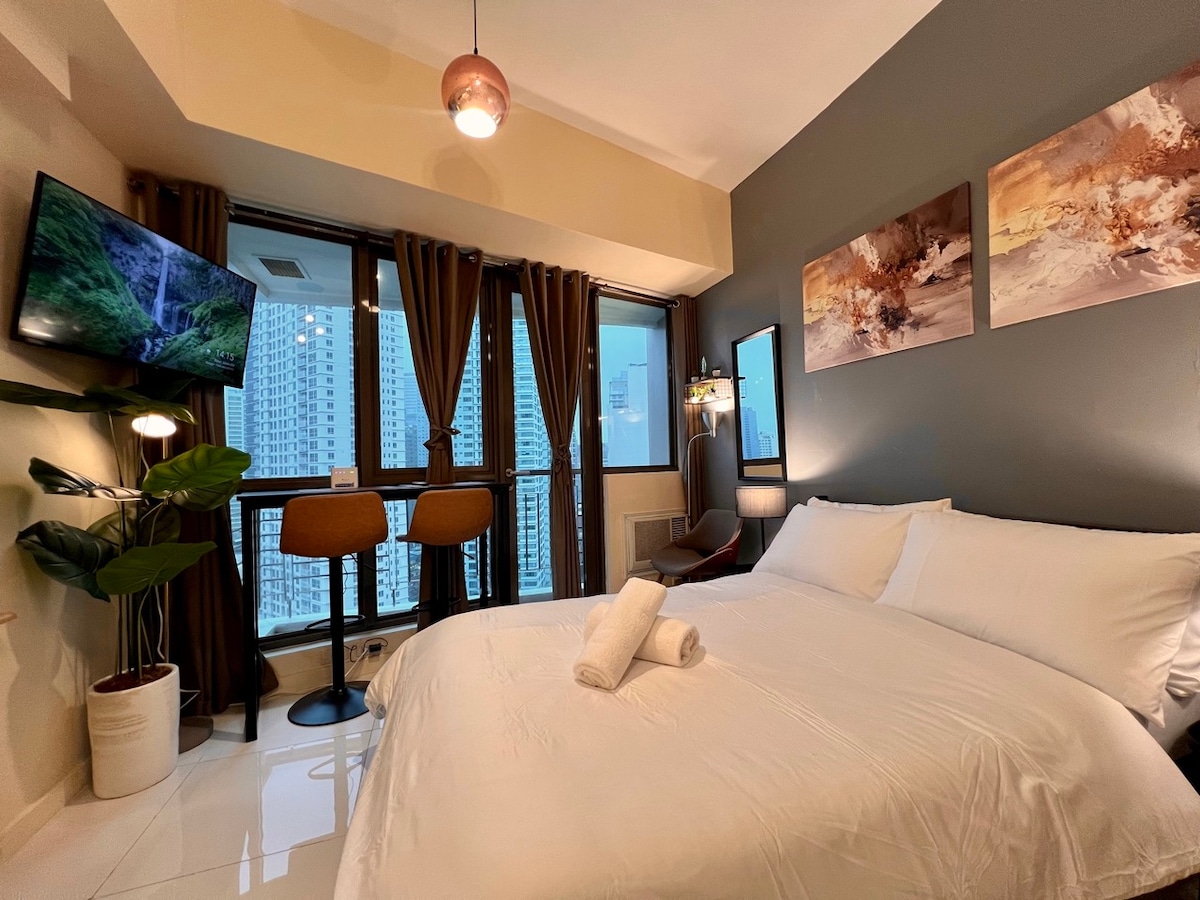 MABUHAY! Ať už jsi na služební cestě, navštěvuješ rodinu nebo cestuješ po Asii, nehledej nic dalšího. Kdysi bývala bytová jednotka s jednou ložnicí, byla nyní přeměněna na prostorné velké studio (čtyřicet tři metry čtvereční!). Nacházející se v jedné z nejvyšších rezidenčních budov na Filipínách, může to být tvůj druhý domov. Pokud máš vybrané termíny rezervované, můžeš se také podívat na naše další spravovaná studia kliknutím na můj profil.