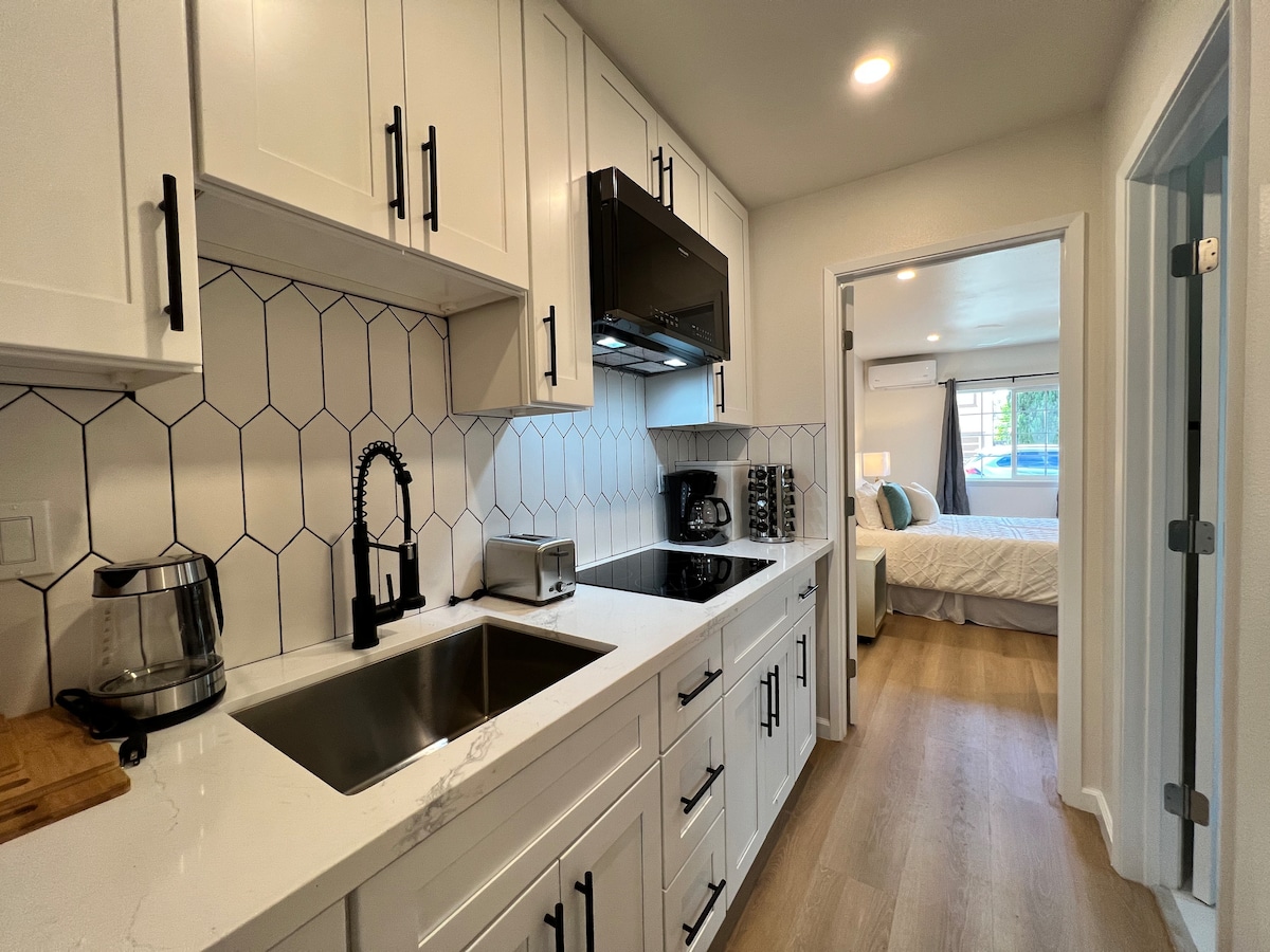 Velmi vítáni uctiví cestovatelé, kteří projdou super tichým soukromým garsonkou v evropském stylu s výhledem na záliv. Schouli se před 4K televizí pro filmové noci v tomto stylovém, zvukotěsném hnízdě s luxusní matrací, pračkou a sušičkou! — přivítat kojence a děti. — Přečti si vše, aby ses vyhnul/a překvapením. — 5 minut chůze do parku, Caltrain/restaurace; 10~13 minut jízdy na SFO/Stanford; 20-25 minut SF. — Bez domácích mazlíčků, zákaz kouření/vapování, bez večírku! — rezervace pro 3 osoby, pokud potřebuješ jednolůžko