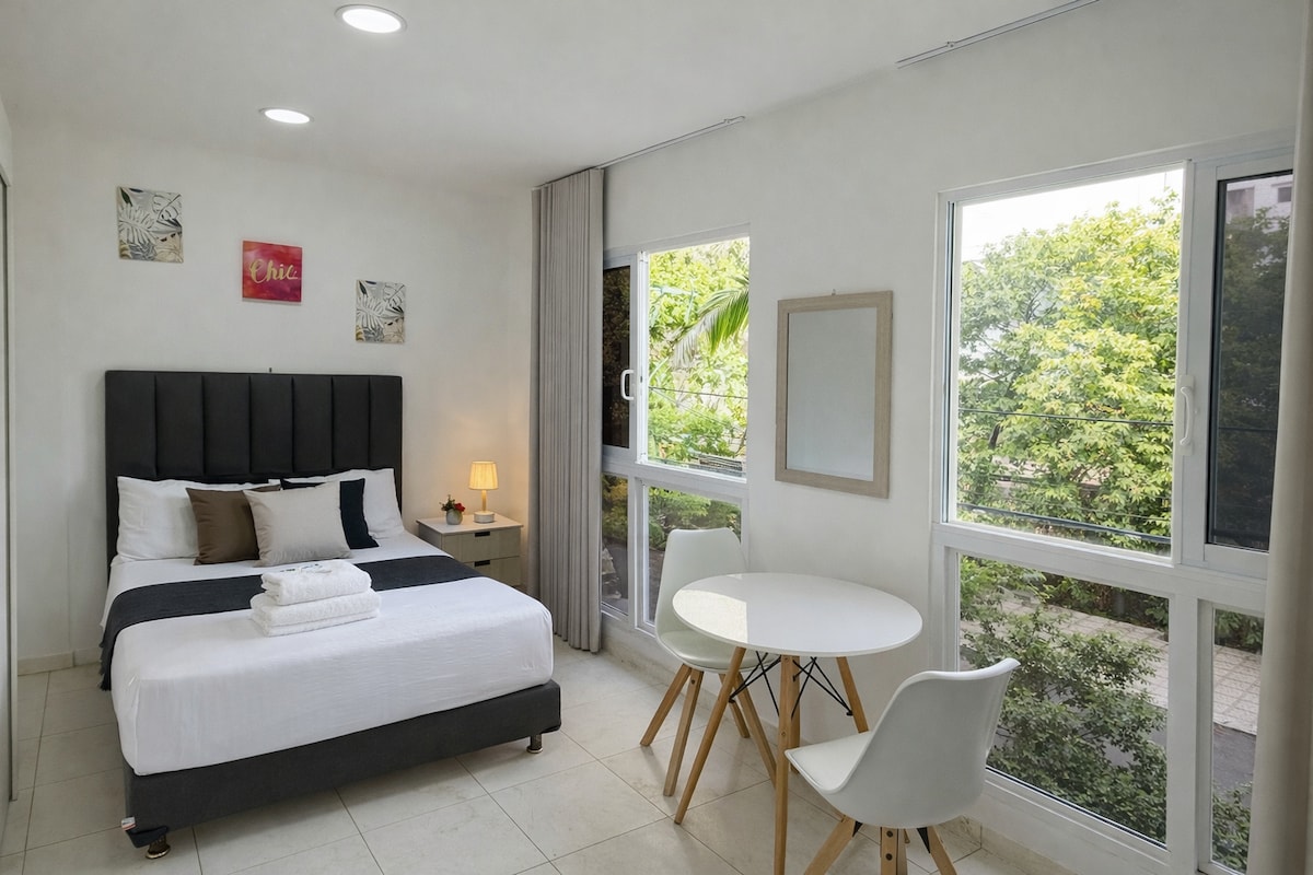 ** EXKLUZIVNÍ JEDNOTKA BEZ POPLATKŮ ZA SLUŽBY AIRBNB ** Vítejte v našem luxusním podkrovním bytě v Cali, inspirovaném přírodou. Díky rozloze 44 m², soukromé venkovní vířivce a kapacitě pro 4 osoby je to moderní oáza. Obývací pokoj, jídelna a plně vybavená kuchyně nabízejí pohodlí a styl. Soukromý pokoj a koupelna se vším potřebným zaručují klidný odpočinek. Bezkonkurenční poloha v blízkosti turistických míst.