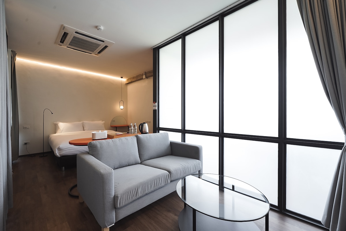 Čistá, moderní a minimální jedna ložnice s obývacím pokojem a spíží s teplou sprchou a bezplatným Wi-Fi. Hosté si mohou vychutnat sdílený coworking ve společných prostorách, na zahradě a v kavárně. Poskytli jsme manželskou postel velikosti Queen s ložním prádlem, ručníky, mýdlem a vysoušečem vlasů. Postel se perfektně hodí pro 2 osoby, ale k dispozici je matrace navíc a rozkládací pohovka pro třetí a čtvrtou osobu (nabíjecí). *ZDARMA* na vyžádání úklid/úschovna jízdních kol/zavazadel