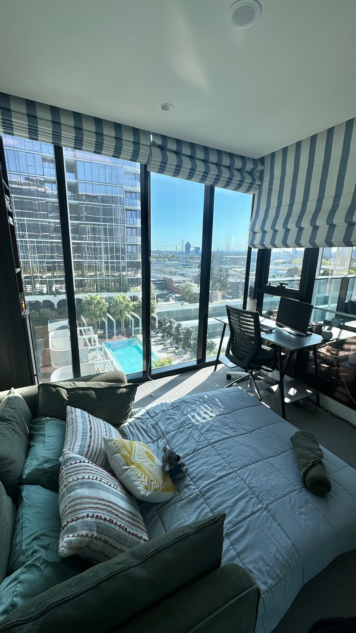 Ohromující střešní byt v Port Melbourne v nejvyšším patře s jednou ložnicí, vyhrazenou pracovnou a parkováním pro jedno auto. This resort-style building has amazing amenities including a heated outdoor swimming pool, two spa hot tubs, spacious gardens, as well as roof-top indoor and outdoor funing spaces commanding incredible views of the city and bay. Profesionálně spravovaný společností Holiday Rentals Australia, můžeš si být jist/a, že tvůj pobyt je ve skvělých rukou.