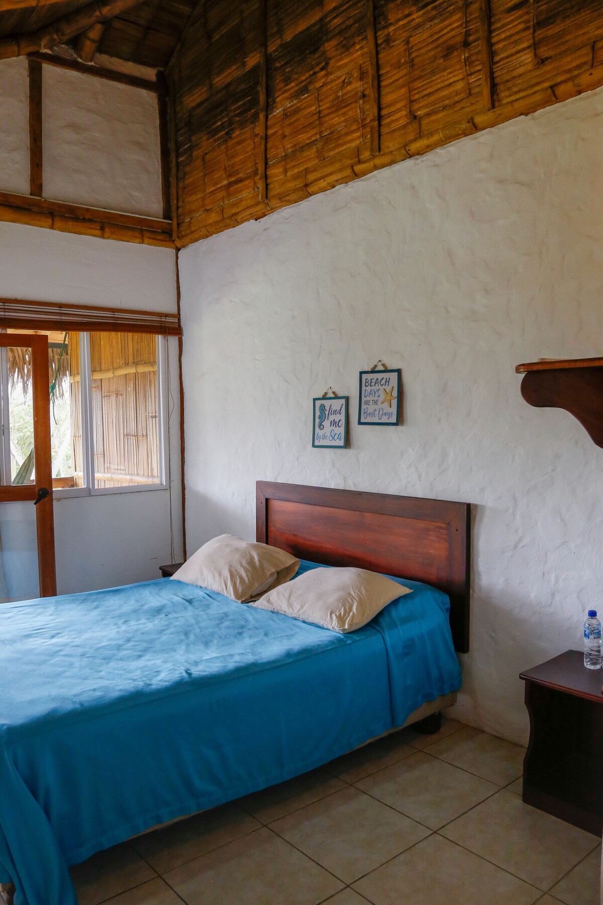 Pro 2 osoby. Jednoduché. Rustikální. Ekologický. Ekonomický. Ideální pro odpočinek. A užijte si všechna zařízení přírodní zahrady. Prostor s houpacími sítěmi. Gril. Společná kuchyně. A 10 metrů od pláže.(Sdílené koupelny). Restaurace na pláži s nejlepší argentinsko-ekvádorskou fúzní kuchyní a nejlepšími koktejly a ledovými pivy. Pokud máte rádi surfování, 100 metrů od místa pro surfování. 350 metrů od vesnice (růžová zóna).