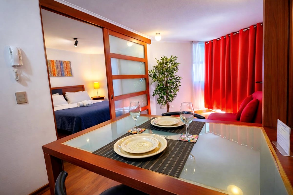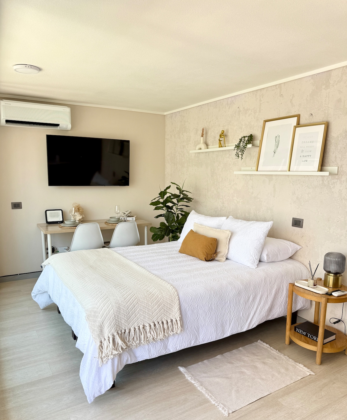 Moderno y acogedor departamento con aire acondicionado en el corazón de Santiago. A pasos del metro y del Centro Histórico, rodeado de museos, mercados y restaurantes. Cama king, cocina equipada, balcón y wifi rápido, ideal para viajes o estadías largas. Edificio seguro con conserje 24/7. Atención personalizada, check-in flexible y recomendaciones locales para que disfrutes la ciudad como un residente, con comodidad y tranquilidad.
