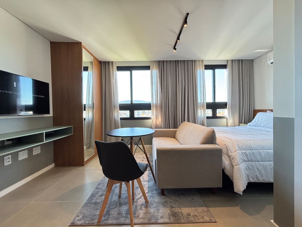 Hospede-se em um studio novíssimo, pensado para oferecer conforto, praticidade e uma localização privilegiada. Em poucos metros, você tem acesso a mercado 24h, padaria, farmácia, diversas lancherias e ao Villa Food Park, com opções de cervejas diferenciadas e ótimas opções de comida. O condomínio complementa a experiência com academia, espaço coworking com rede para momentos de descanso e lavanderia OMO, ideal para estadias curtas ou longas.