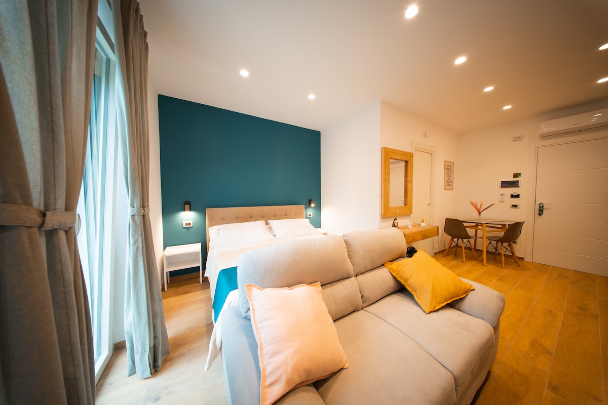 La camera, arredata in stile moderno ed elegante e dotata di ogni comfort, offre la possibilità di godere di un magnifico soggiorno in una nuovissima struttura situata in località panoramicissima dalla vista mare mozzafiato. La struttura offre una ricca prima colazione a buffet in sala vista mare e la possibilità di tuffarsi in una meravigliosa biopiscina immersa nel verde dei nostri giardini. La camera ospita un minimo di 2 persone