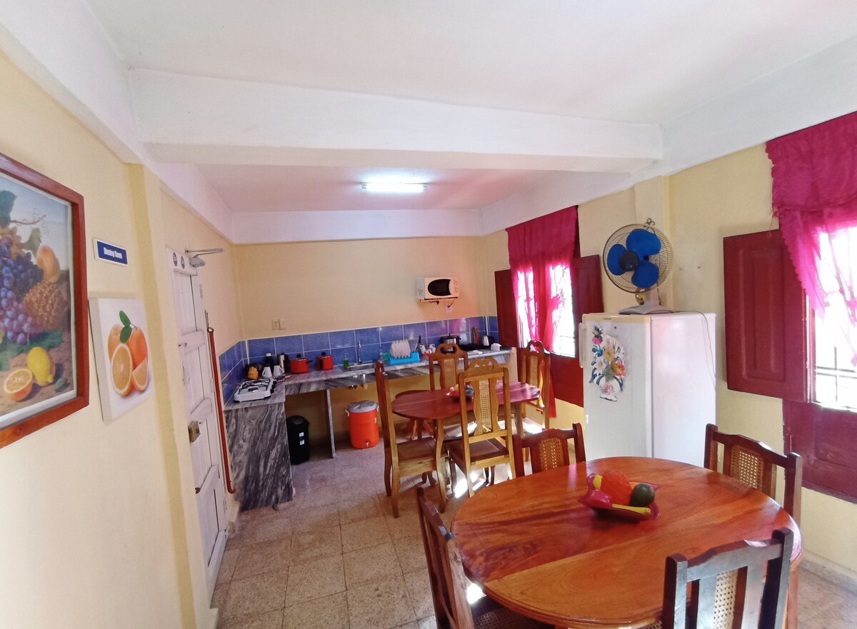 Habitación con entrada independiente y Wifi 24 horas en la 2da planta de nuestra casa con llave privada para los huéspedes, cuenta con 1 habitación para 3 personas con 2 camas, baño privado con agua caliente/fría, aire acondicionado, cocina, terraza privada al aire libre y cubierta de una mata de uva. Se encuentra en un barrio tranquilo de nuestra ciudad, frente al Teatro Heredia y a unos 200m de la Plaza de la Revolución, igualmente del Centro Comercial La Gran Piedra.