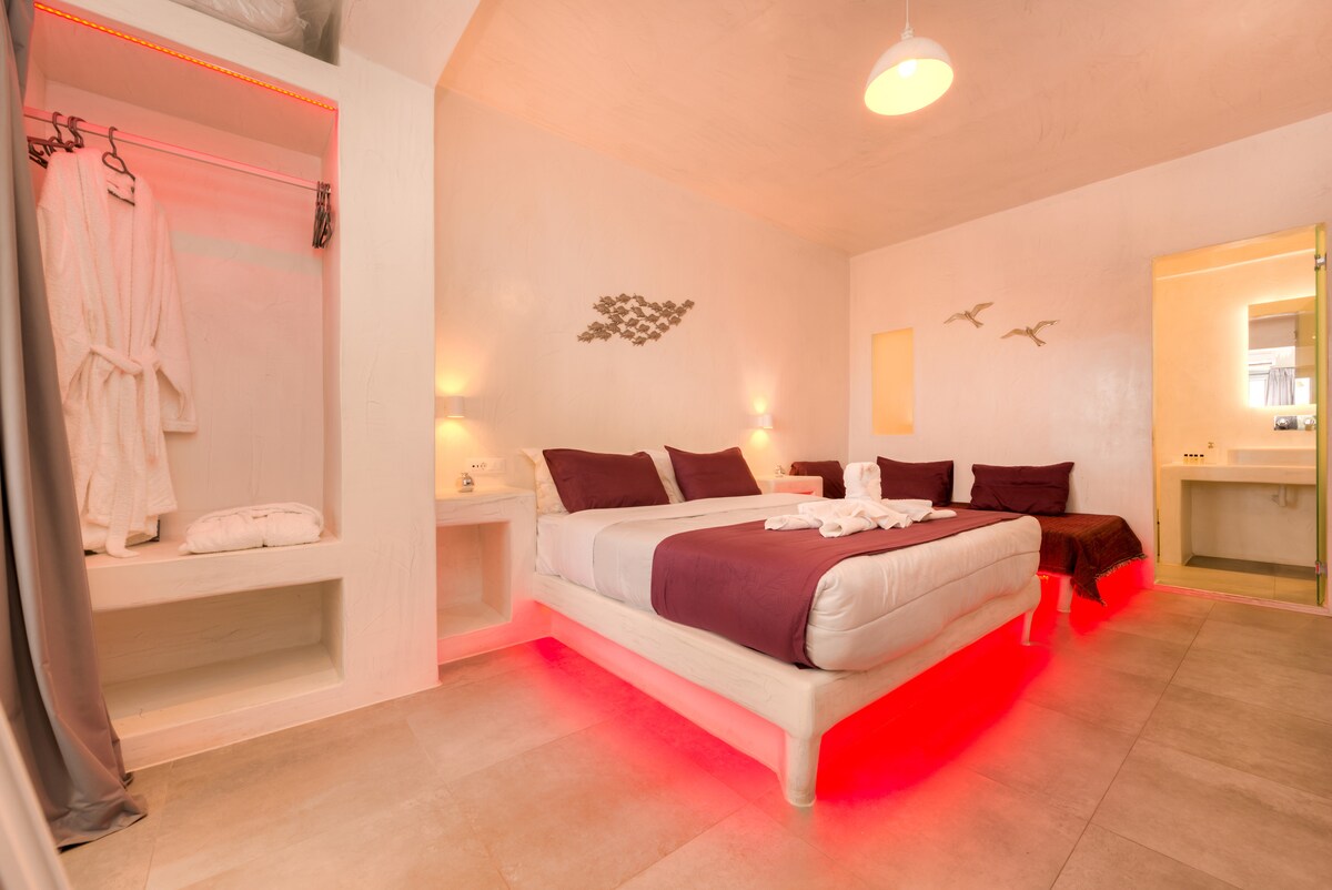 The Suites with a magnificent view of Santorini’s volcano, are located on the upper floor of the property. Luxurious, spacious, modern, and furnished with high-end furniture, their main goal is to provide relaxation at the top level. Additionally, the balconies of the suites offer a Jacuzzi and a dining area for our guests to experience sunny Santorini anytime during their stay.