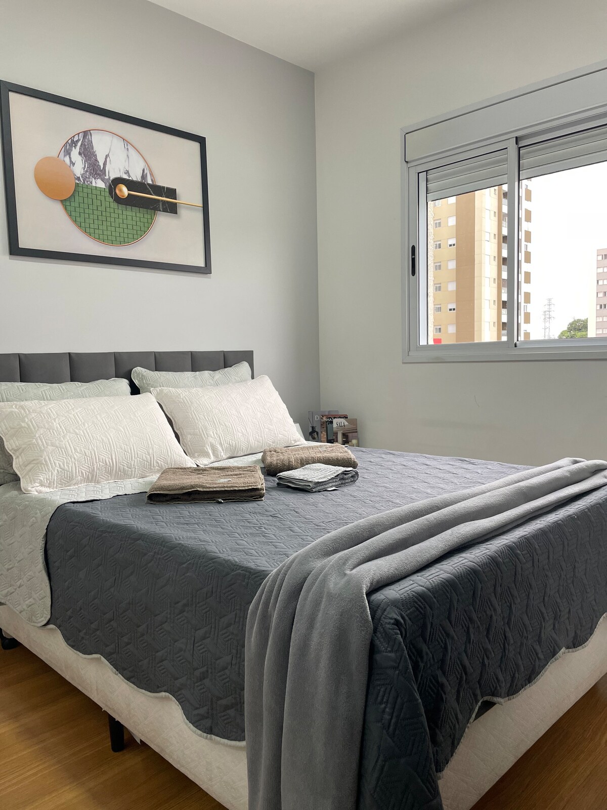 82m² moderní byt, 2 ložnice (1 apartmá), plně zařízená a vybavená kuchyň. Velký balkon, apartmá s balkonem, novým nábytkem, pohodlnou postelí, chytrou televizí a rychlou wifi. Domácí kancelář, plynové topení a parkovací místo. Výborná lokalita, před nákupním centrem Colinas a se snadným přístupem k městským silnicím. Ideální až pro 4 osoby. Pohodlí a praktičnost ve vznešeném regionu! Piscina, sauna, Mercadinho, 24-hodinová brána, 2 kryté prostory.