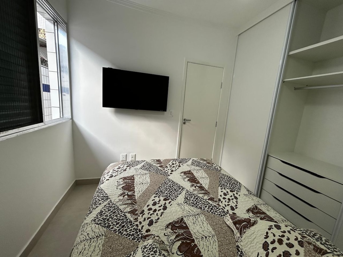 Apt super pohodlné, klimatizované a před mořem (pěšky v písku). Nachází se v jednom z nejlepších regionů São Vicente, v blízkosti nákupního centra, bank, centra města a supermarketu. S pohodlnou manželskou postelí, již s ložním prádlem. Plus 50palcová televize s NETFLIXEM a rozkládací pohovkou. Plně vybavená kuchyň se sporákem, lednicí, mikrovlnnou troubou, stolem se 4 stoličkami a myčkou nádobí. Kromě servisní oblasti. S parkovacím místem. Nonstop vchod, kompletní monitorovací systém a elektronický zámek.