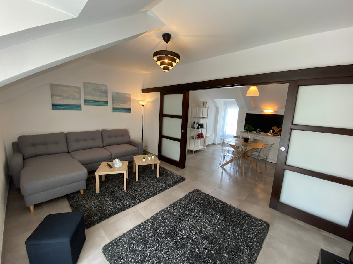 Tichý a světlý byt se nachází v srdci Sarzeau, v malé budově se dvěma byty. Soukromý pokoj s televizí. Možnost uzavřít obývací pokoj pro druhou ložnici se skutečnou rozkládací pohovkou. Free parking at Place des Trinitaires about ten meters away. V blízkosti všech obchodů, pláže v okolí, 20 minut od Vannes. K dispozici je Wi-Fi Na místě jsou k dispozici hry/knihy.