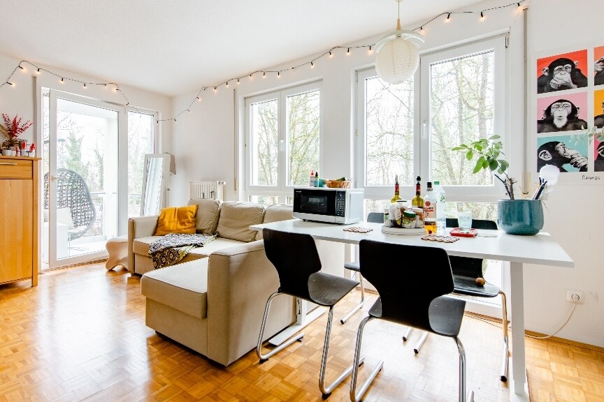 Velmi pohodlný, kompletně zařízený a pěkně zařízený dům s velkými společenskými prostory, velkými ložnicemi, posilovnou, zahradou a parkováním ve velmi pěkné části Mnichova. 3 patra: 1. patro: Kompletně vybavená kuchyň, jídelna a velký obývací pokoj. 2. patro: 3 ložnice, koupelna a balkon. 3. patro: Velká ložnice, kancelářské prostory a posilovna. Supermarket, lékárna, pekárna, biergarten, příroda a veřejná doprava hned za rohem.